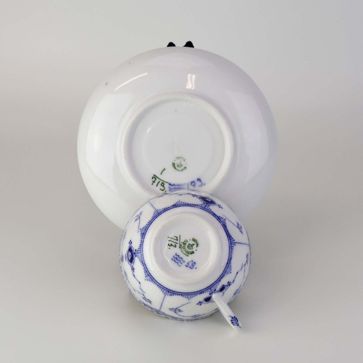 Fremstår med mindre brugsspor på koppens topkant samt to blå prikker på underkoppens bagside.