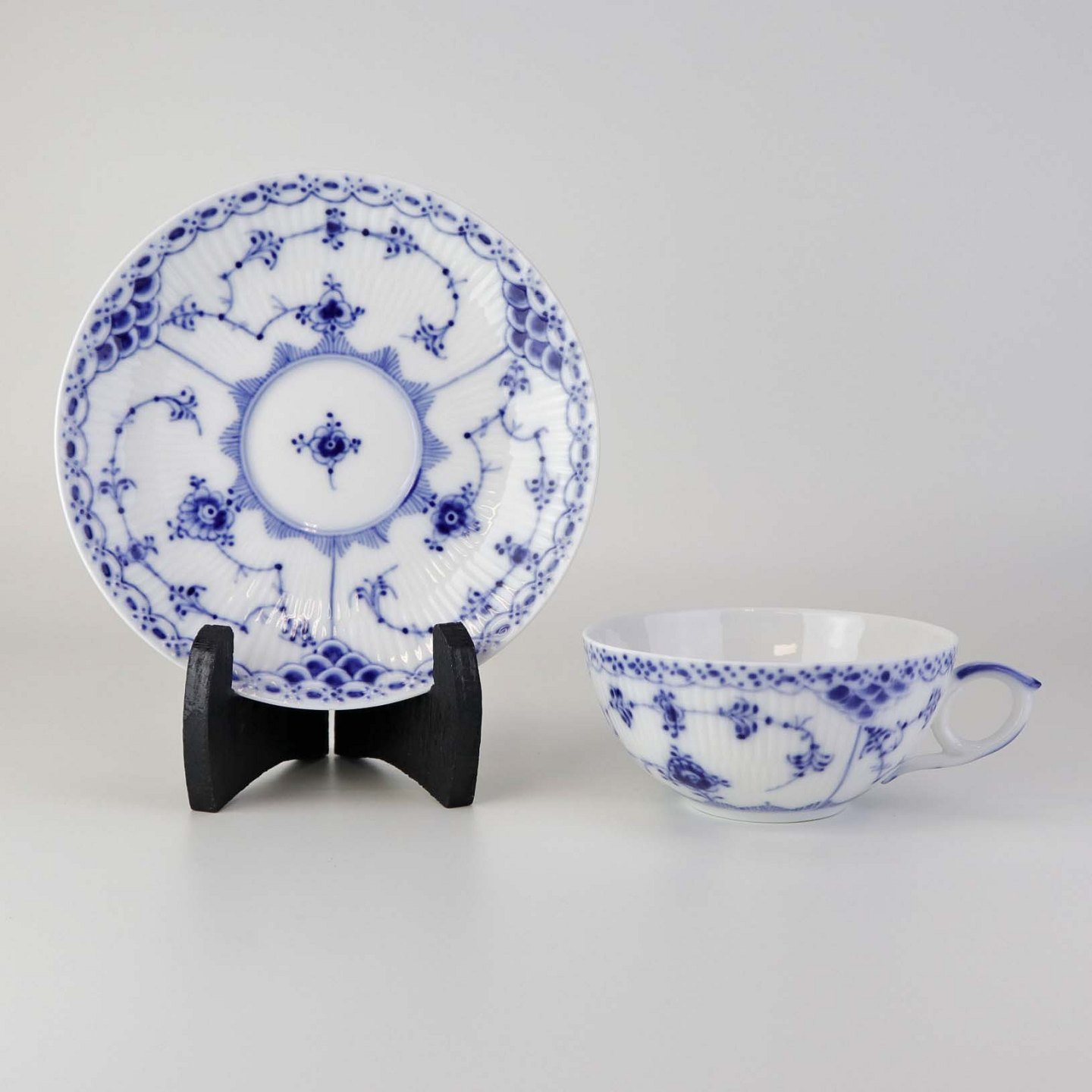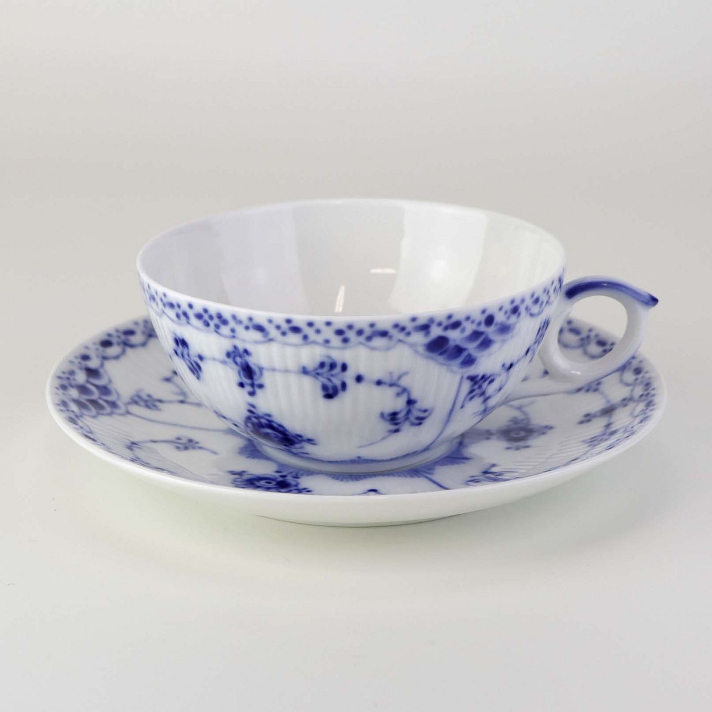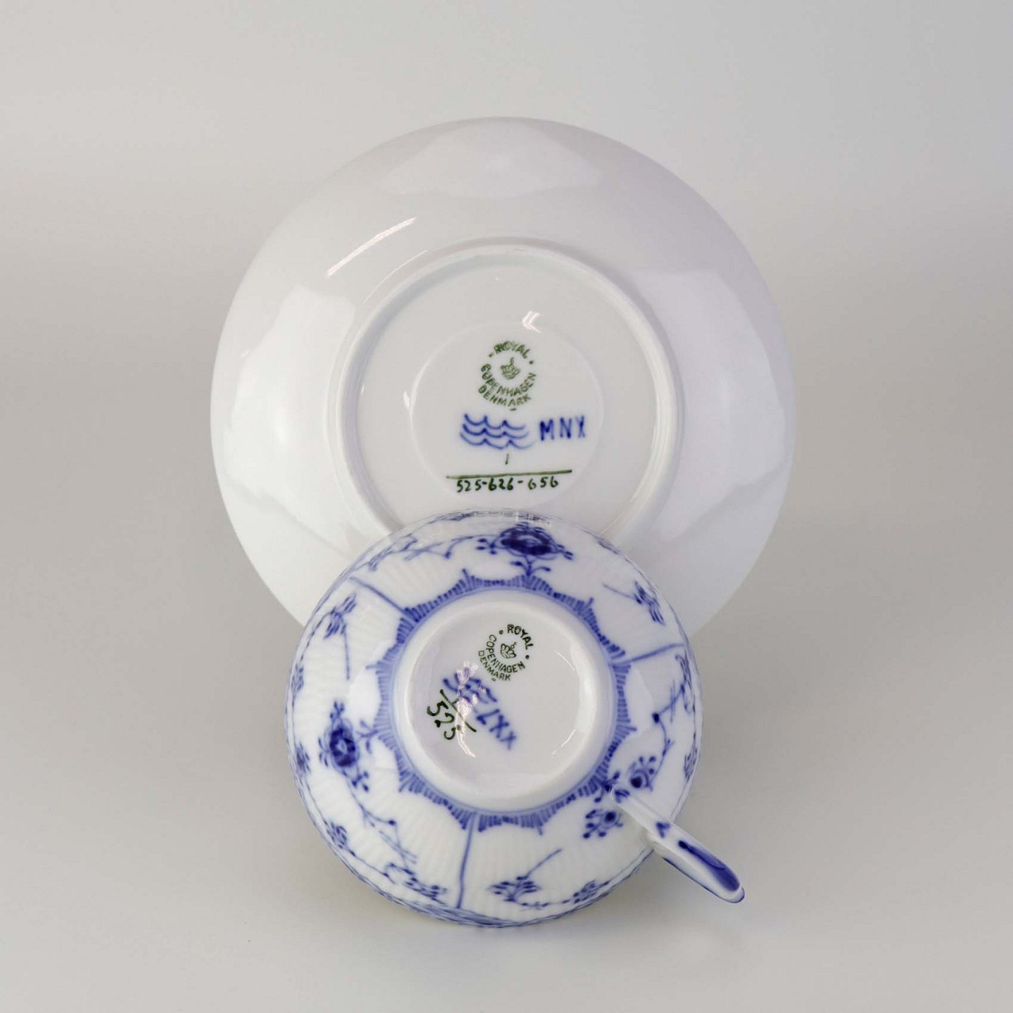 Mellemstørrelsse tekop med underkop i kongeligt porcelæn fra stellet Musselmalet Halvblonde. Nr. 1/525 og 1/525-626-656Design Arnold Krog