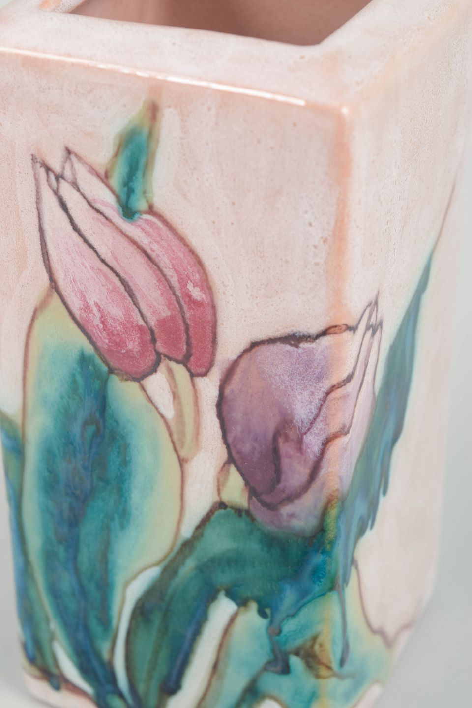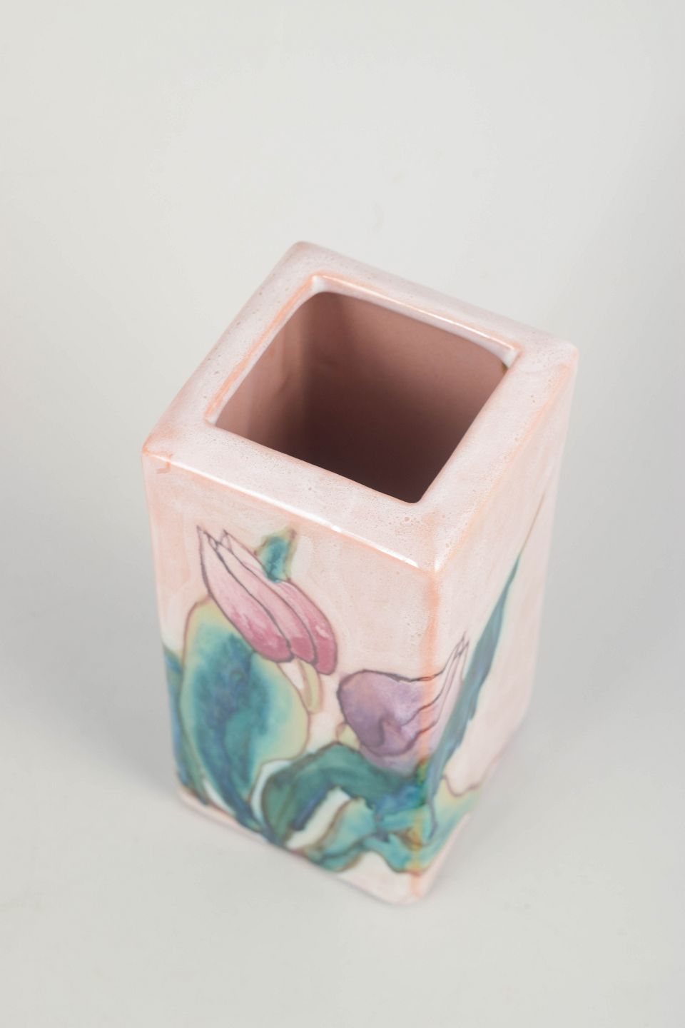 Rektangulær hånddekoreret vase i stentøj med motiv af tulipaner i bløde rosa, grønne og lilla nuancer.