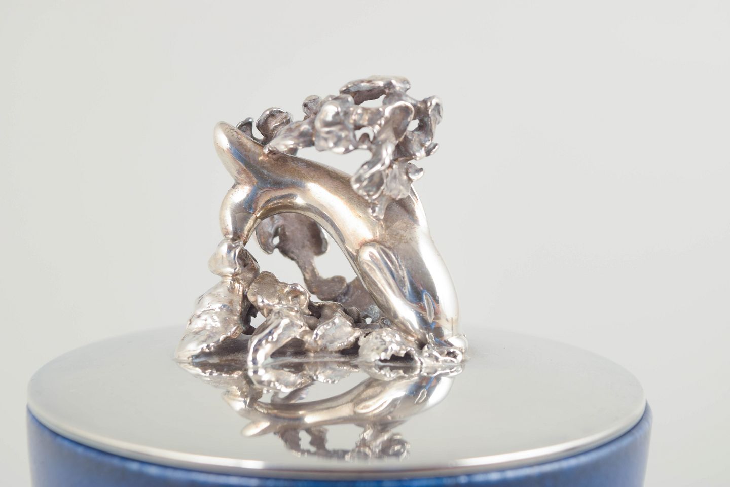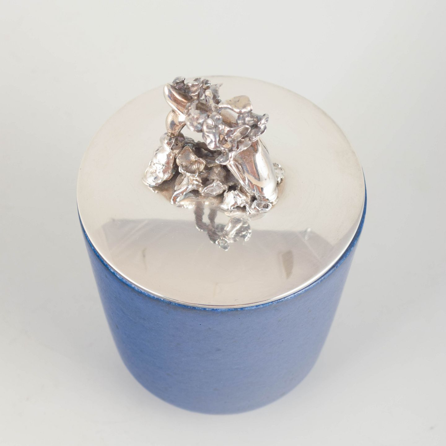 Elegant cylindrisk stentøjskrukke i karakteristisk Saxbo-blå glasur, monteret med et massivt sterling sølvlåg udført i Aage Weimars organiske, skulpturelle formsprog.