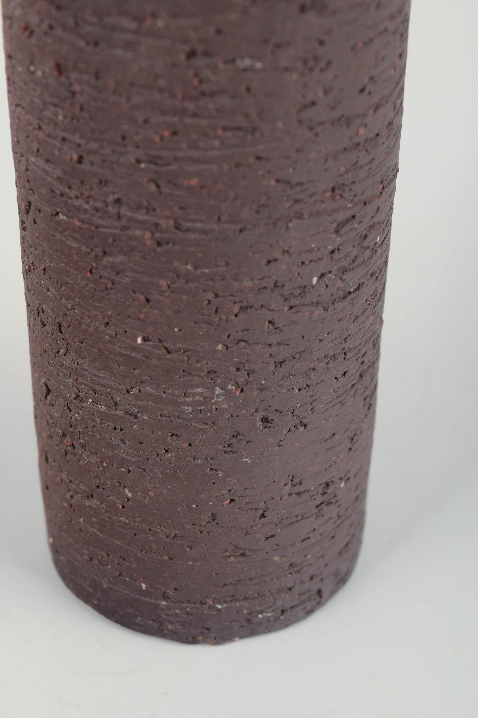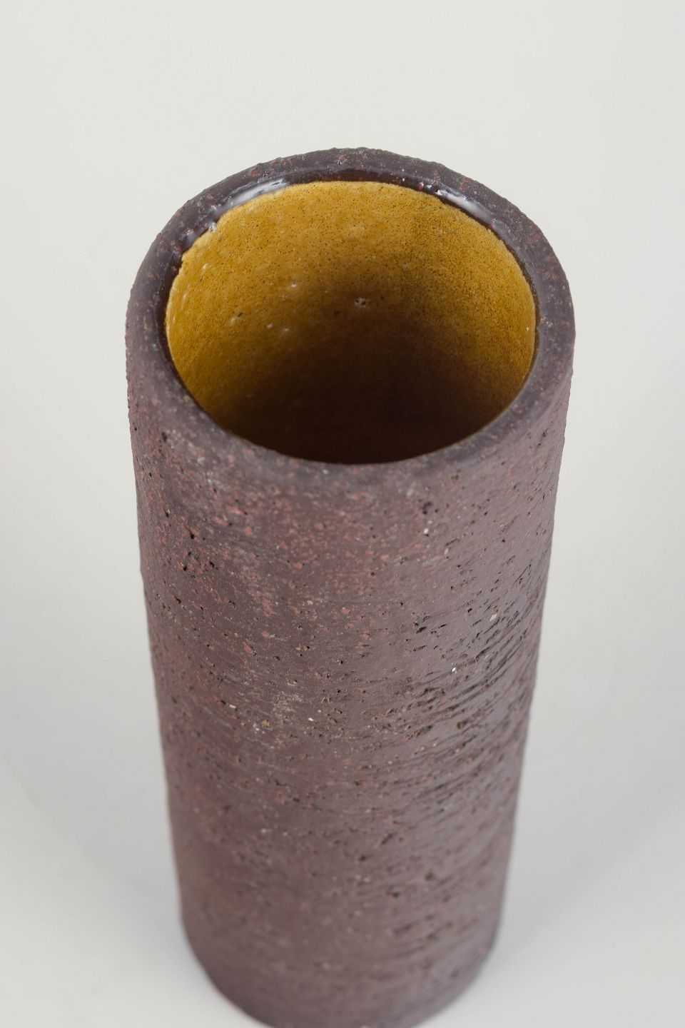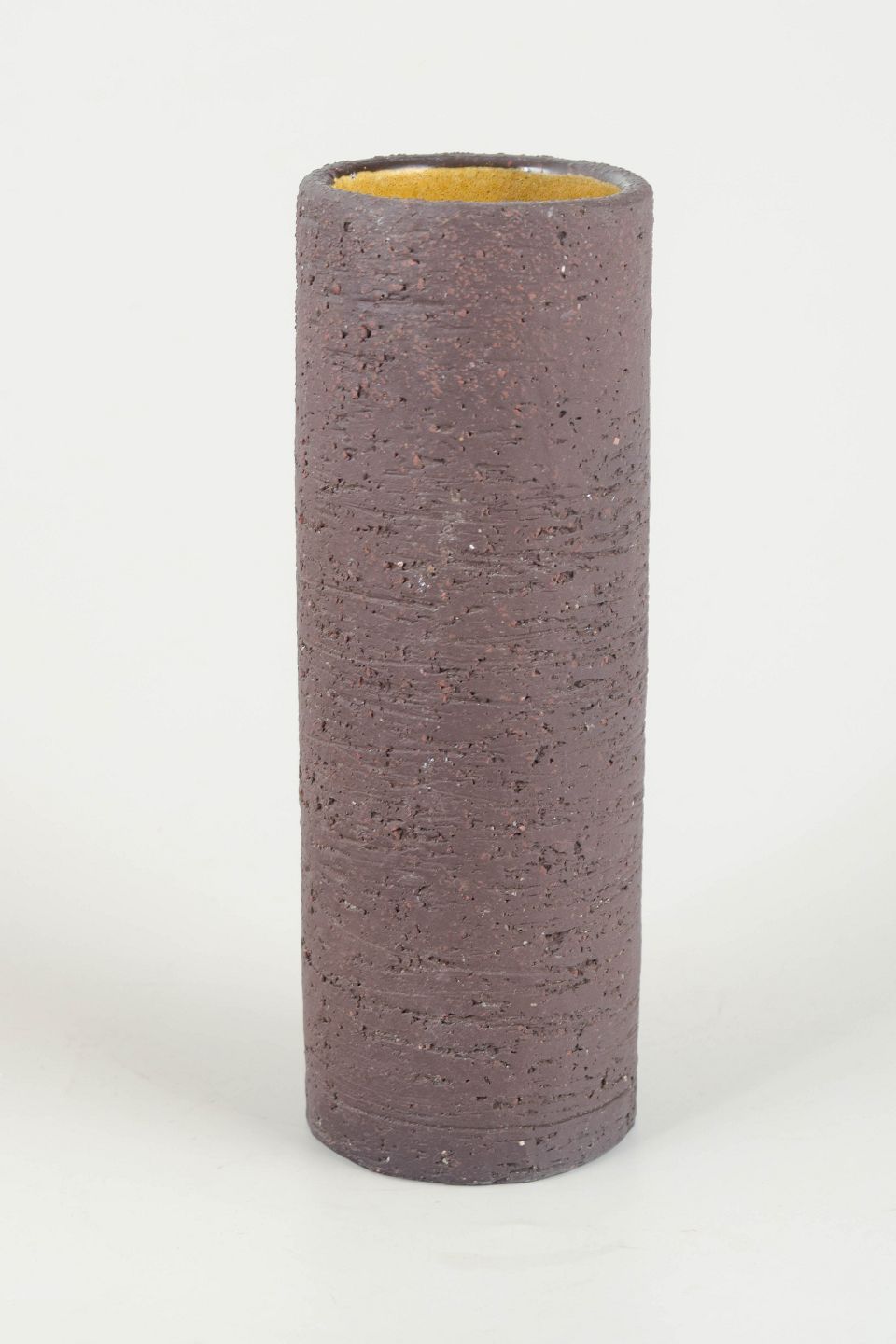 Cylindrisk vase i karakteristisk chamotte-stentøj med rå, tekstureret overflade i dyb brun tone og kontrasterende gul glasur indvendigt. Et typisk eksempel på Nylunds materialefokuserede formsprog i perioden.
