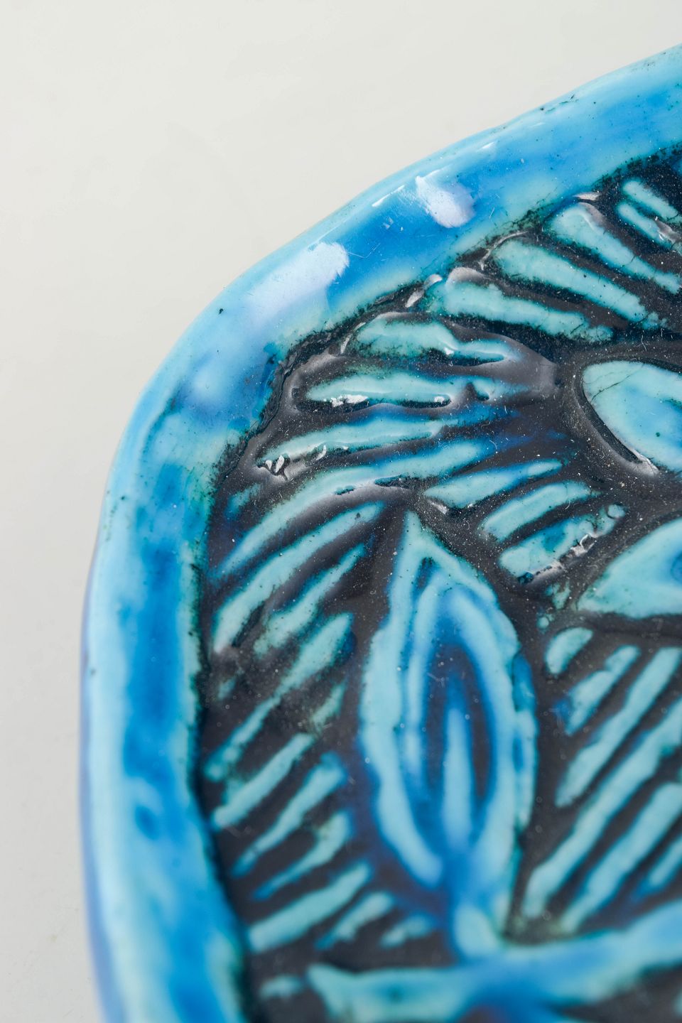 Håndformet skål i keramik med levende turkisblå glasur og indridset dekor i form af stiliseret blomstermotiv. Et karakteristisk eksempel på Nylunds organiske formsprog og farverige udtryk fra perioden.