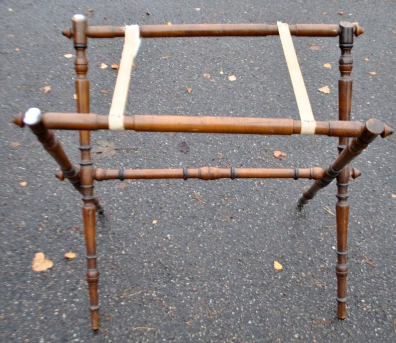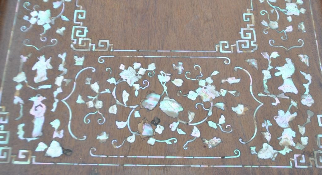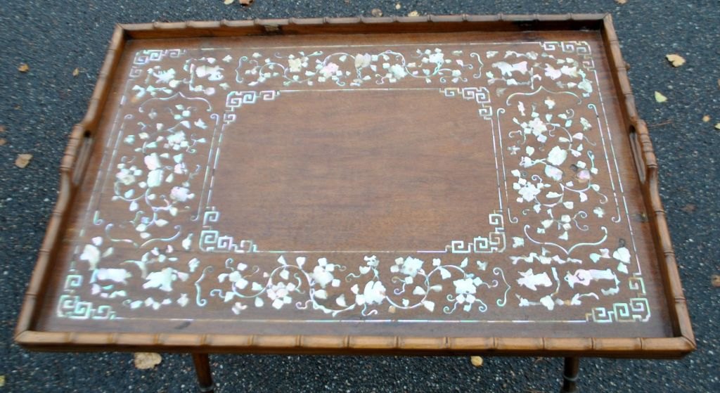 Chinesischer Tabletttisch, 19. Jahrhundert. Tablett aus edlem Holz mit Perlmuttintarsien. Mit zwei Griffen. 48 x 71 cm. Klappbarer Sockel, Höhe: 65 cm.Bestellnummer: 28577