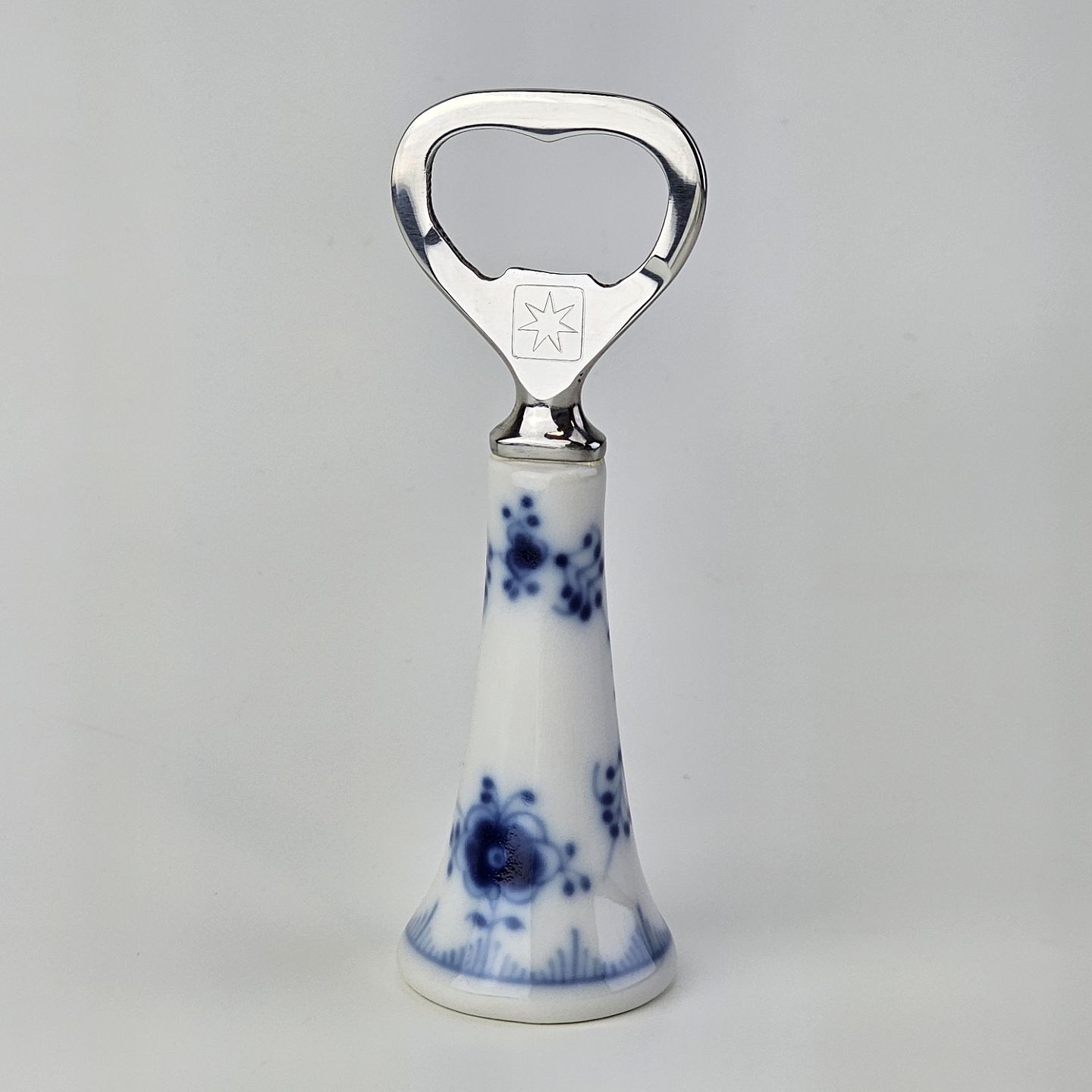 Oplukker i kongeligt porcelæn med hoved i rustfrit stål med graveret Maersk logo fra stellet Musselmalet glat.Nr. 1/2309