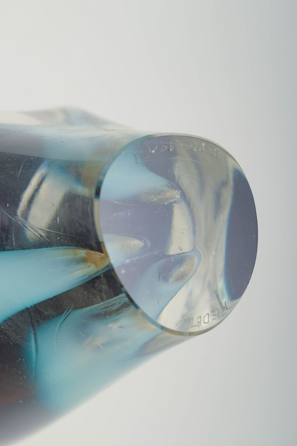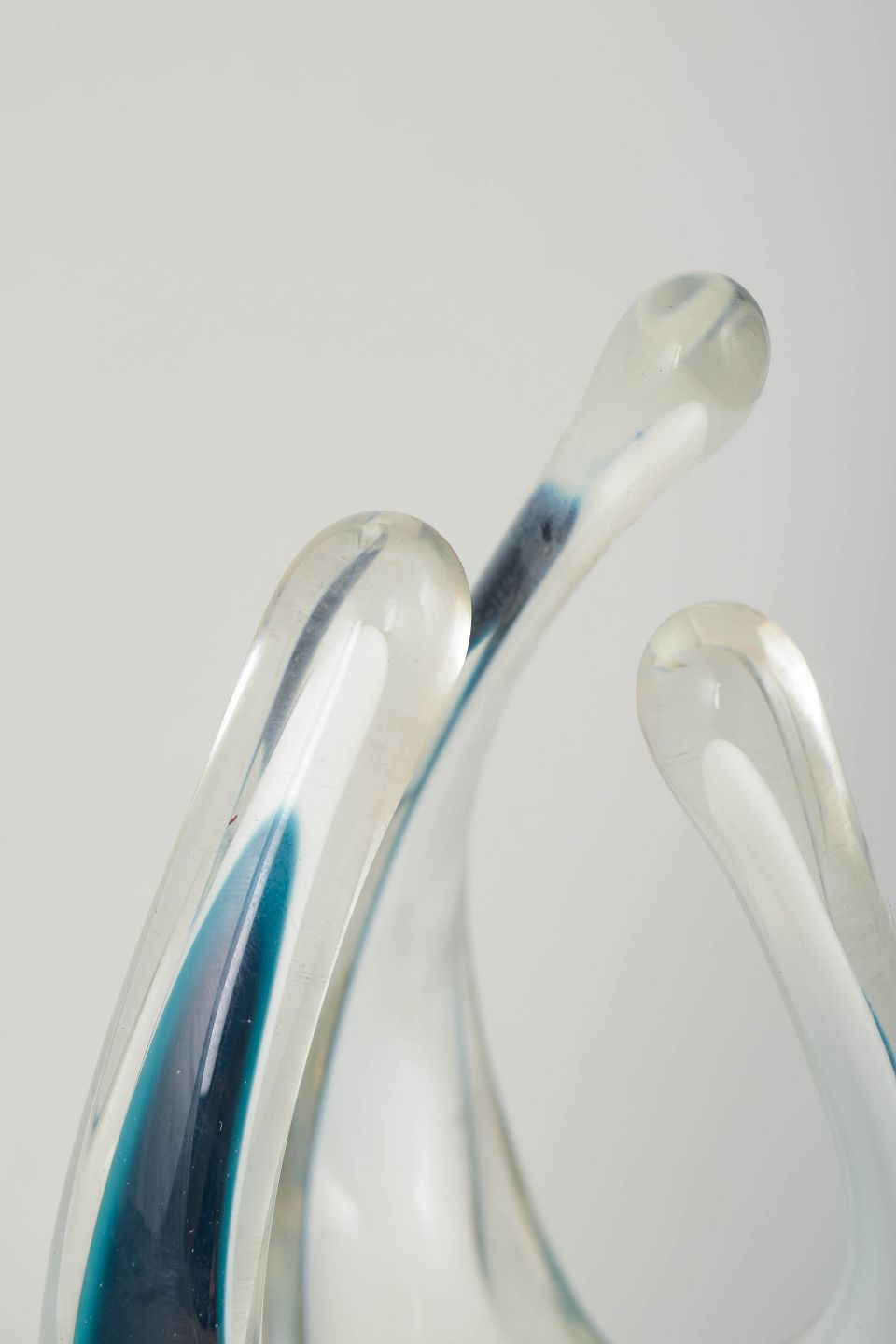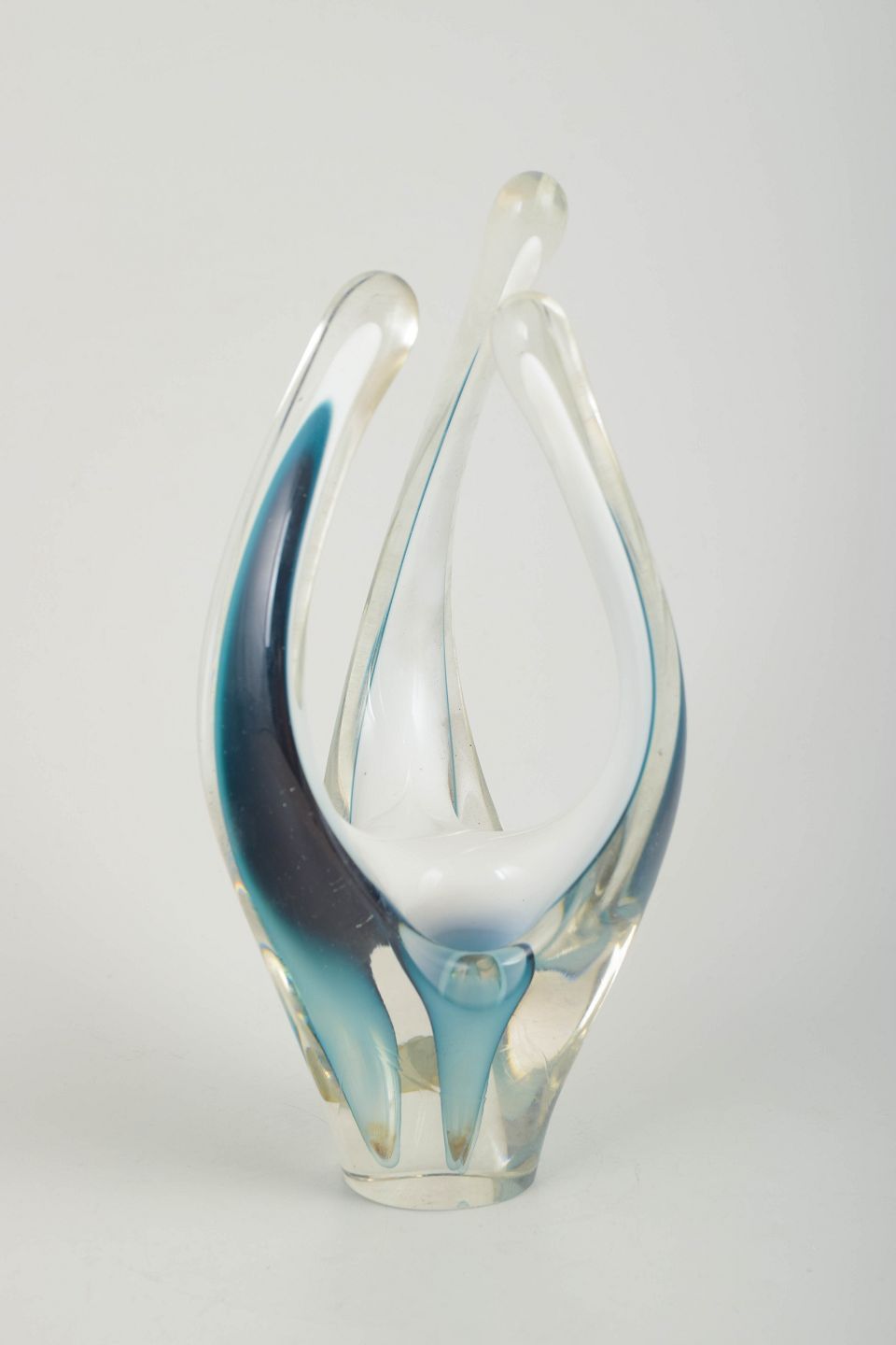 Skulpturel, organisk formet kunstglas vase i klart glas med lag i turkis, dyb blå og hvid. Mundblæst med de karakteristiske opadstræbende arm- eller flammeformer fra den tidlige Coquille-produktion. Elegant farvespil og stærk midcentury æstetik.