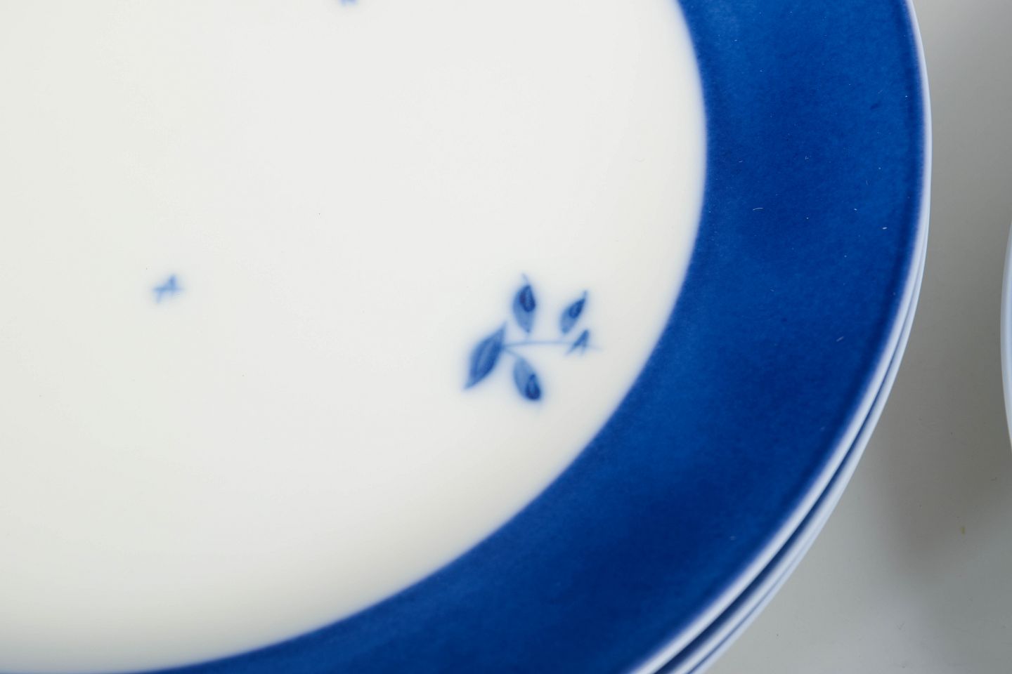 Sjældne, store tallerkener i porcelæn med bred blå kant og fine håndmalede blomsterdekorationer. Klassisk Royal Copenhagen-æstetik i et rent og elegant 60’er-udtryk.