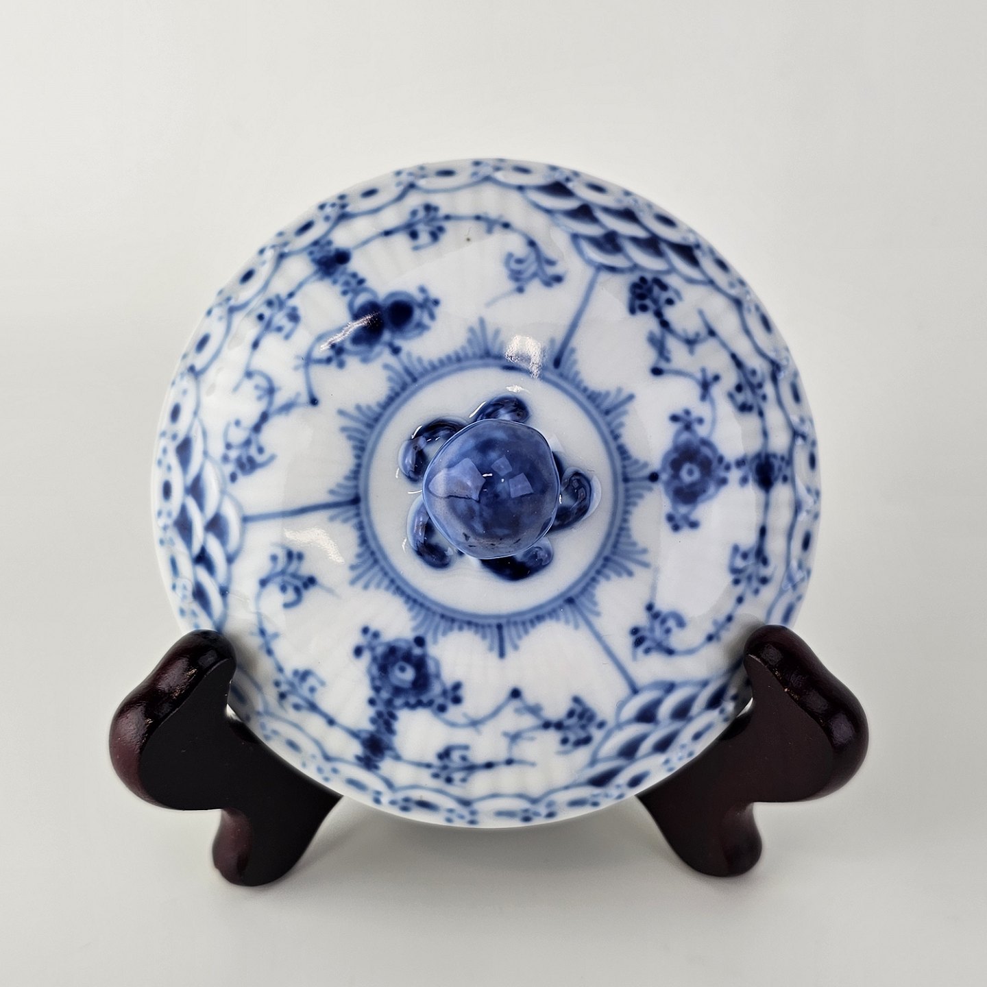 Musselmalet halvblonde er riflet hvidt porcelæn med dekoration af blå ranker og en kant med blonder.