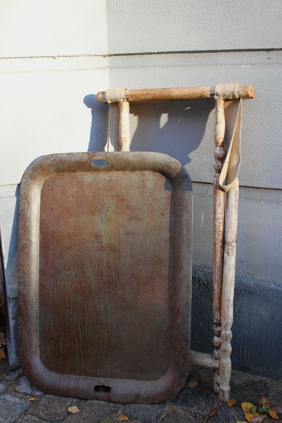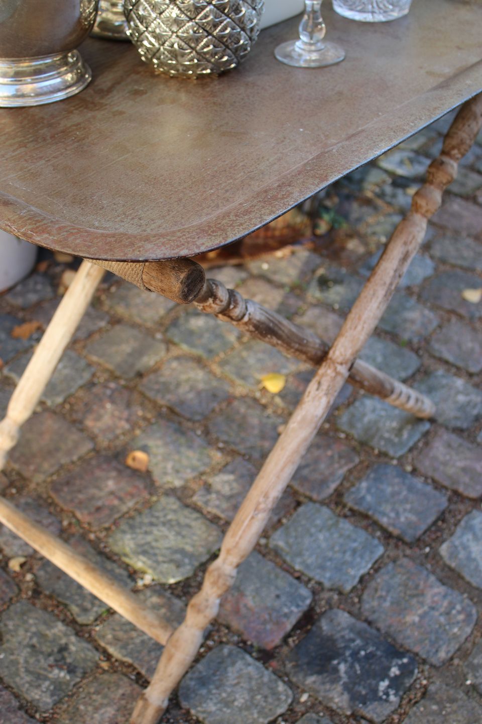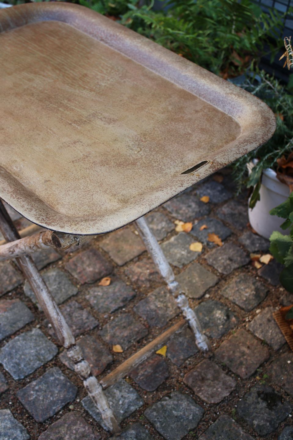 Gammelt bakke bord med understel i træ med en rigtig fin patina ogstor rå metalbakke på toppen...