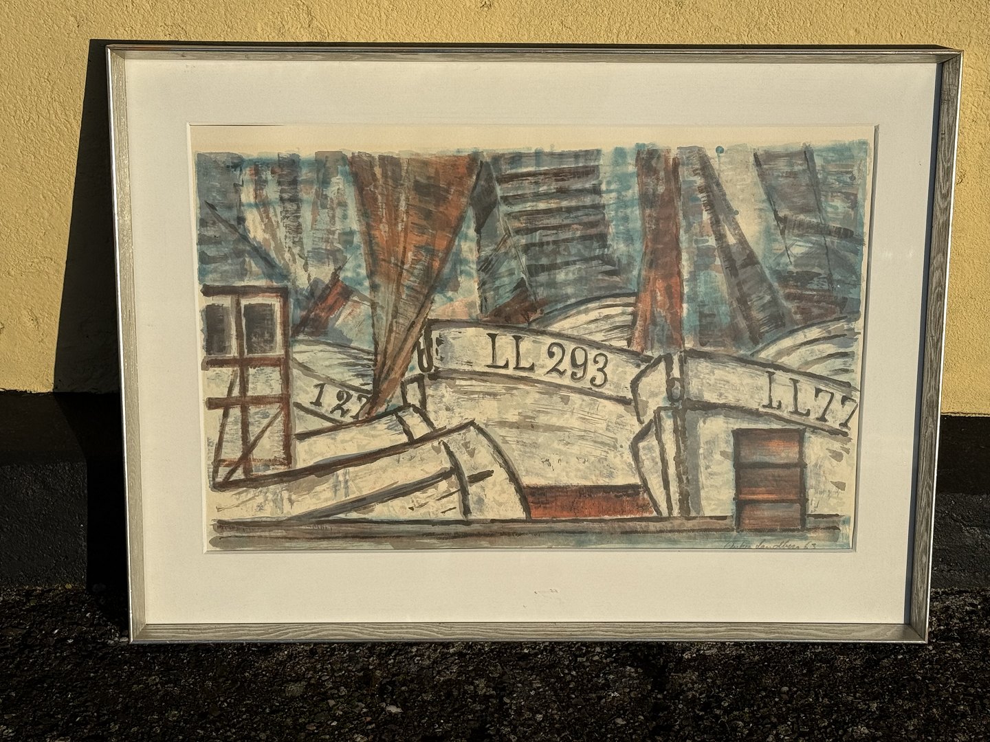 Anker Landberg, Lithografie im Rahmen, Fischerboote, signiert Anker Landberg 63, Maße mit Rahmen: 79 x 58 cm *Die Lithografie ist im Passepartoutrahmen etwas eingesunken, ansonsten in gutem Zustand.*Lager: 1