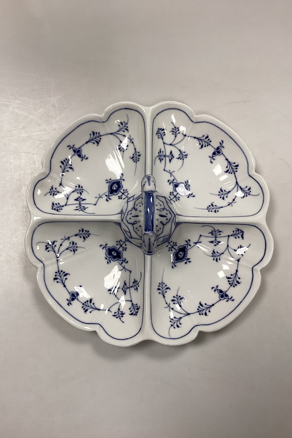 Royal Copenhagen Musselmalet Riflet Kabaretfad No. 396. Fire ruminddelinger og hank. 1. Sortering. Måler 28,5 cm / 11,22 in. i dia.x 9 cm / 3,54 in. i højden med hank.