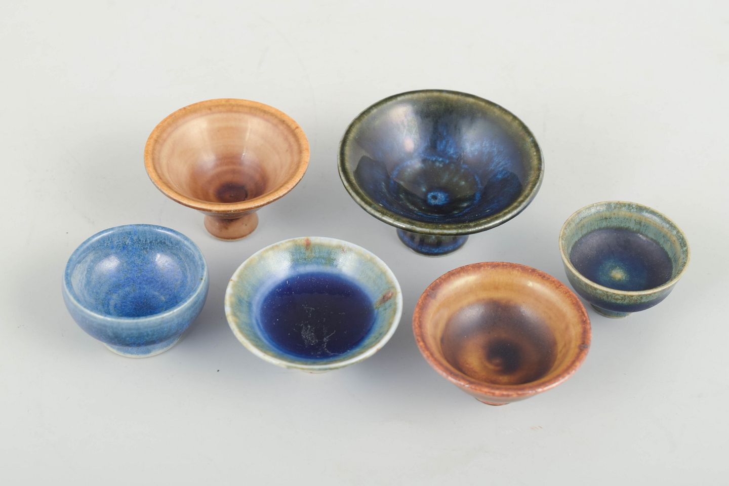 Et dekorativt sæt med seks hånddrejede miniature stentøjsskåle, hver med individuelt formudtryk og varierede glasurer i blå, grønne og brunlige toner. Et charmerende eksempel på svensk studiokeramik i lille skala.