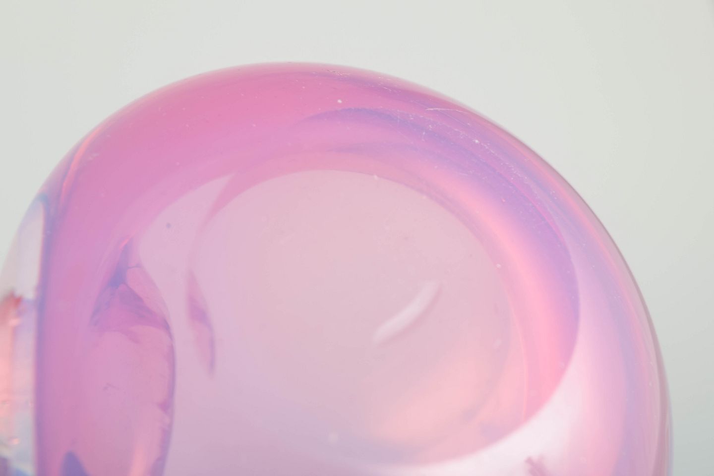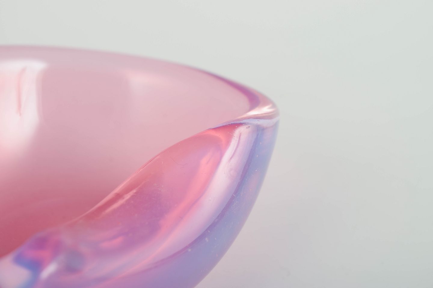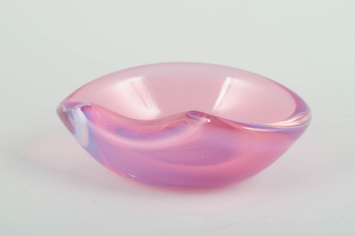 Murano kunstglas skål, 1960’erne.Lille, organisk formet skål i mundblæst glas med bløde kurver og delikat farvespil i rosa og lavendeltoner, typisk for Murano glas fra perioden.