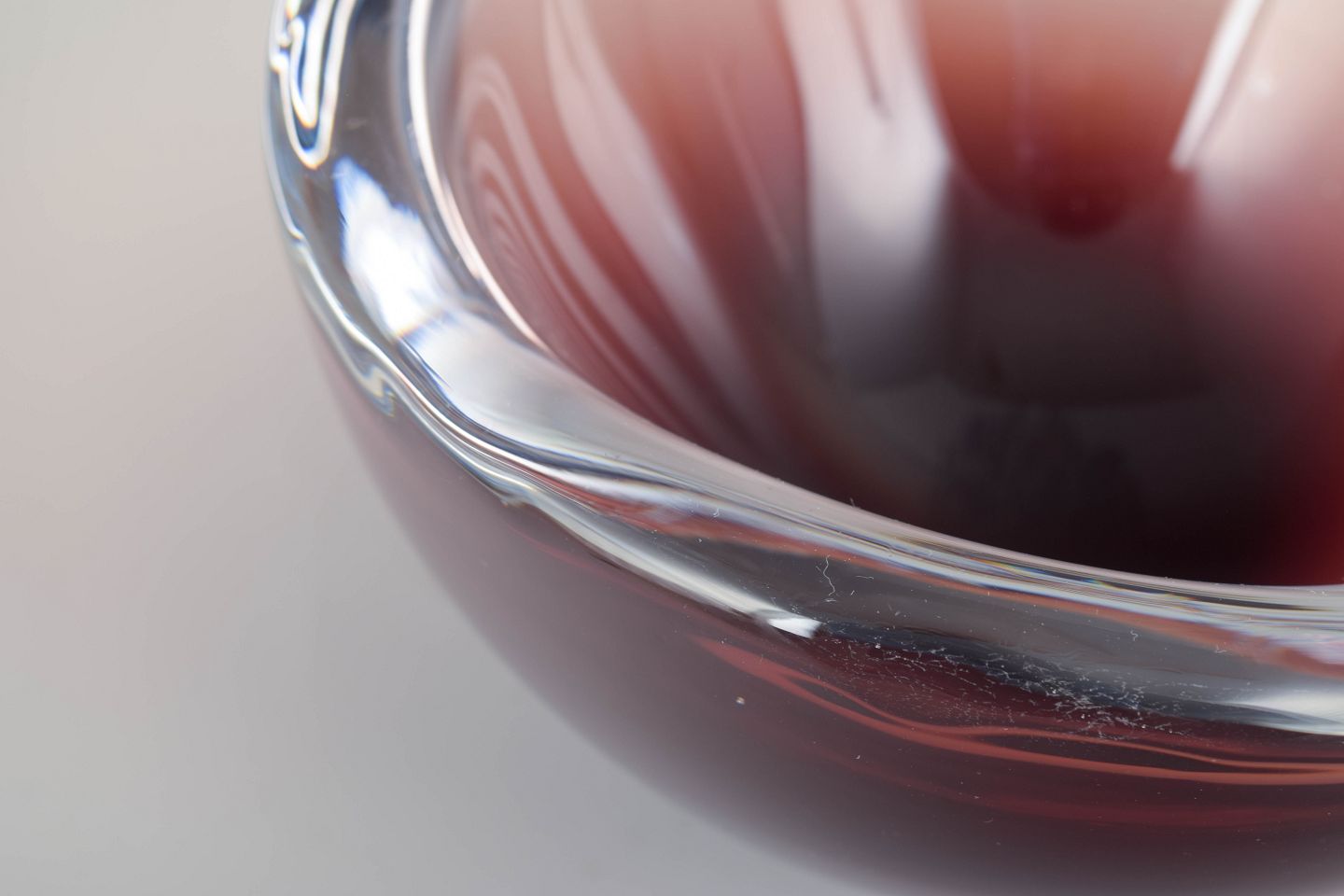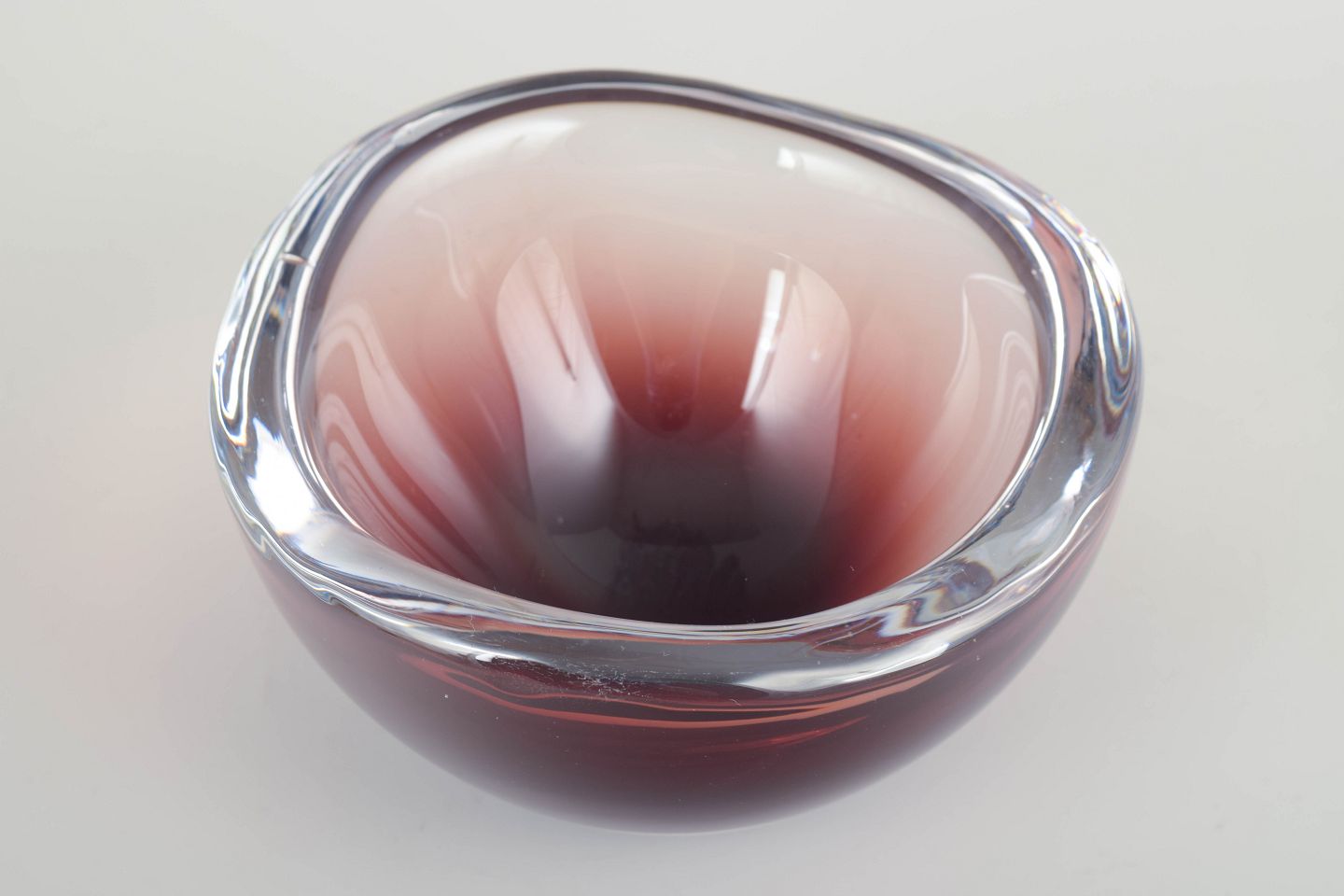 Murano kunstglas skål, 1960’erne.Organisk formet skål i mundblæst glas med lagdelt farvespil i dybe rubin- og klare toner, typisk for Murano-glas fra perioden.