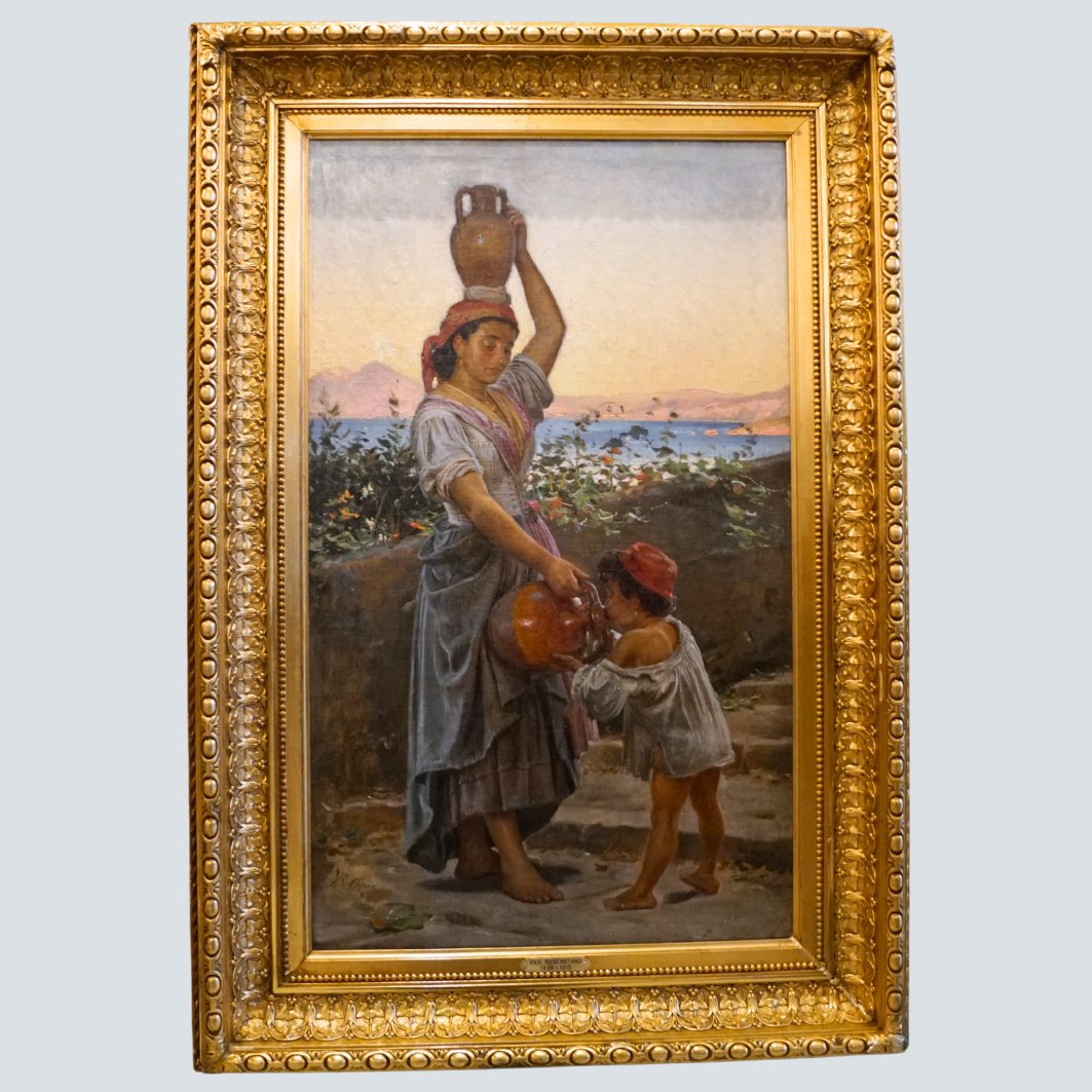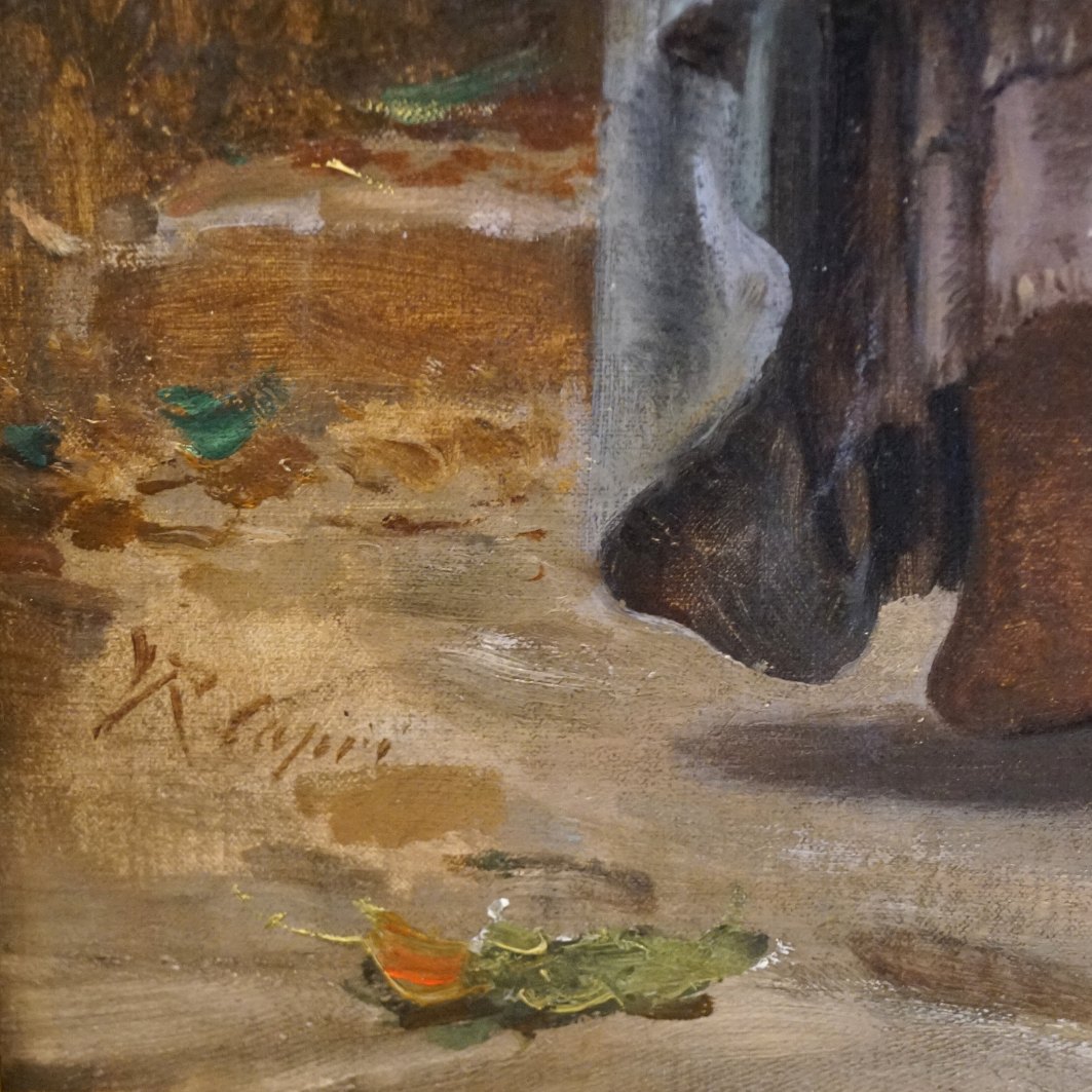 Vilhelm Rosenstand; Oliemaleri med kvinde og barn, motiv fra Italien. Olie på lærred. Signeret.Lysmål: 71 cm x 44 cm.