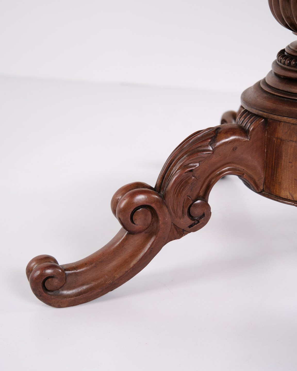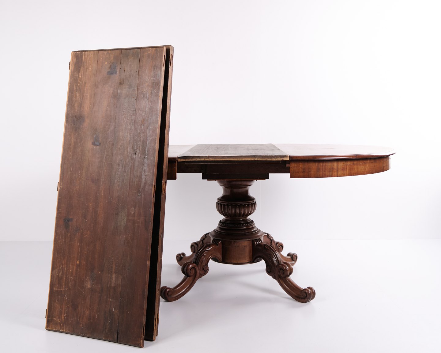 Søjlebord i sen Empire stil fra ca. 1840’erne, udført i mahogni med rige udskæringer og klassisk formsprog. Bordet kan udvides med fire tillægsplader og fungerer både som spisebord og dekorativt møbel i større rum.— Periode: Ca. 1840’erne