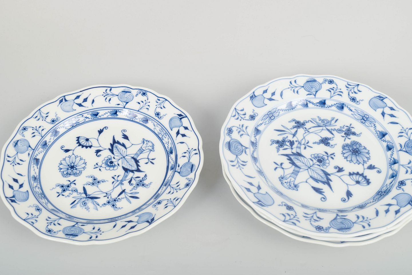 Meissen løgmønstretFire middagstallerkener, tidligt 1900-tal.