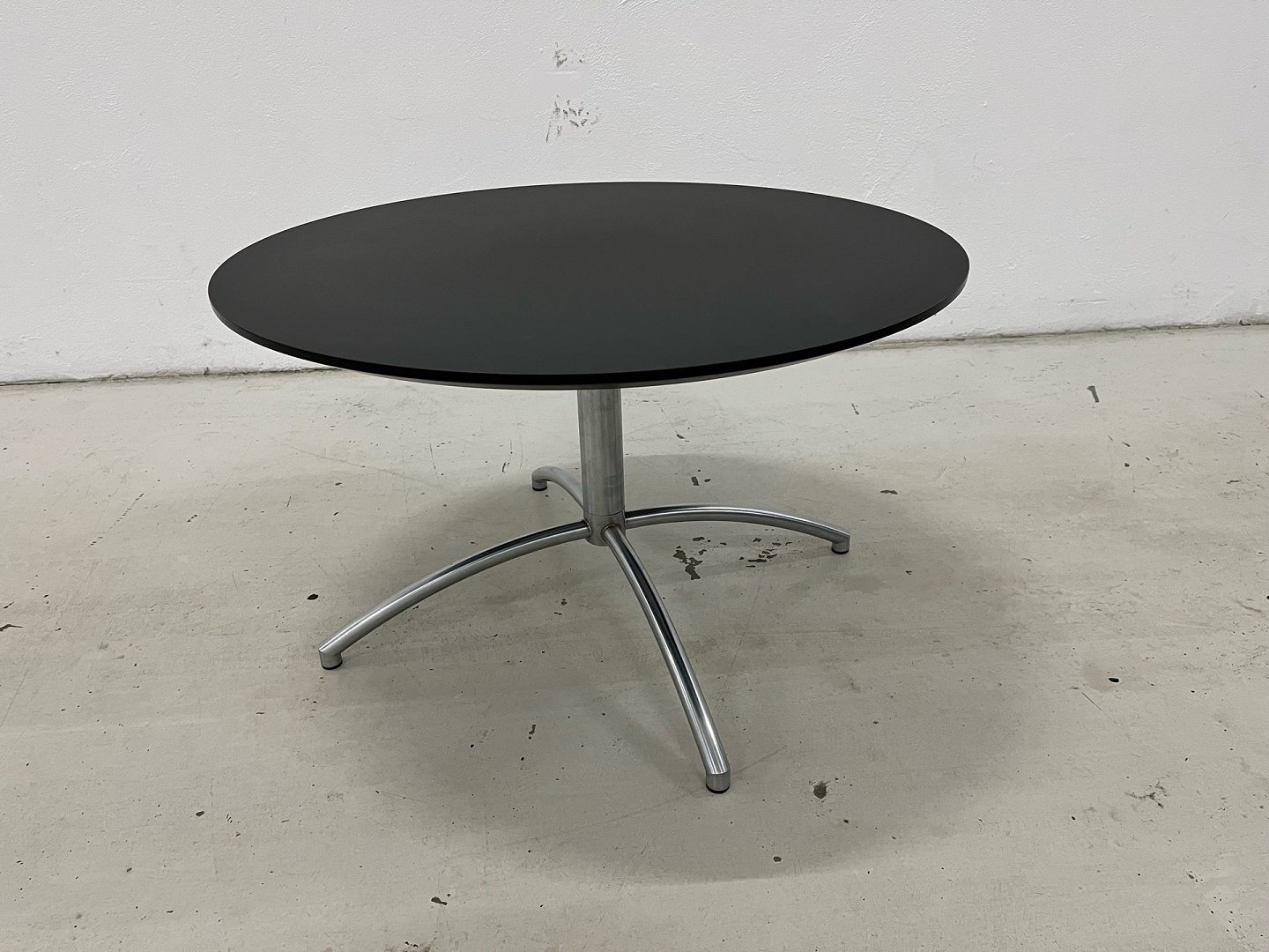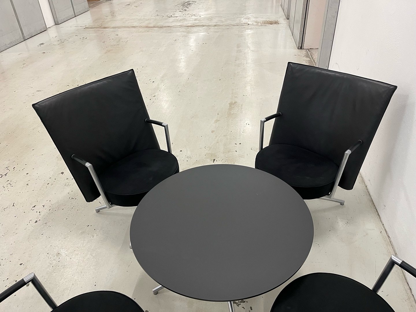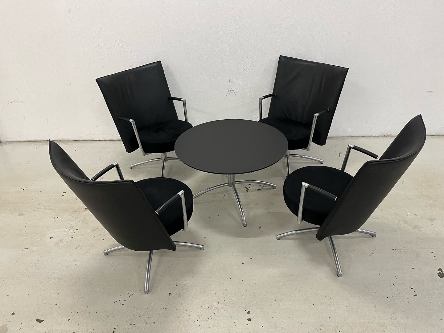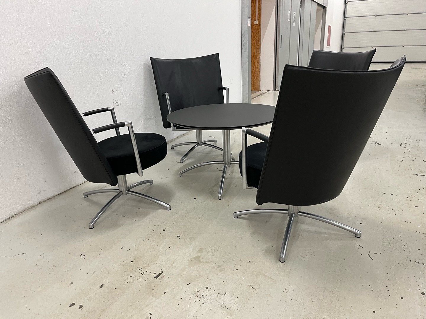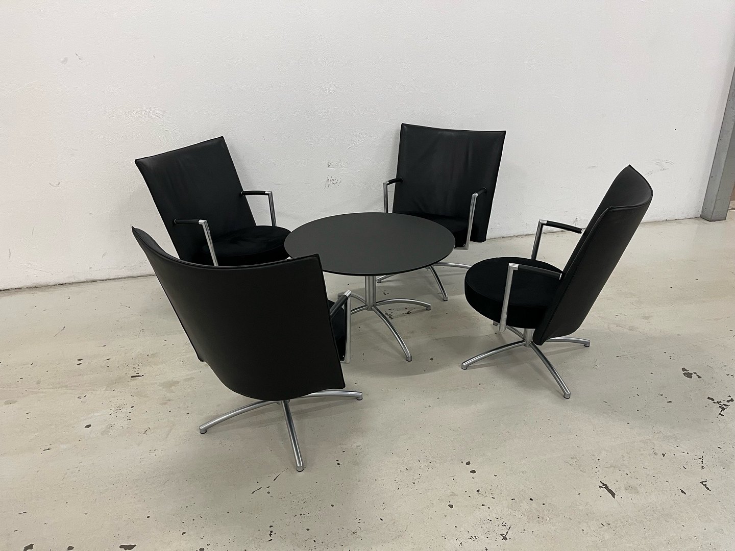 Set: 4-teilig. Erik Jörgensen EJ70 Partner Stühle, 1-teilig. EJ90 Tisch in schwarzem Laminat. Neupreis: 85.000 DKK. Das Set befindet sich in sehr gutem Zustand. Produktbeschreibung: EJ70 Partner Stuhl. Modell „Partner“ (EJ 70) von Erik Jörgensen, entworfen von Joannes Foersom & Peter Hiort-Lorenzen. Gefertigt mit einem matt verchromten Stahlrahmen mit Federrückstellung, der eine automatische Rückkehr in die Ausgangsposition gewährleistet. Vollständig gepolstert mit Leder an der Rückenlehne und Alcantara an der Sitzfläche, was sowohl Komfort als auch eine exklusive Optik bietet. Ca. Maße: Breite 70 cm, Tiefe 79 cm, Höhe 91,5 cm und Sitzhöhe 42 cm. Produktbeschreibung: EJ90 Couchtisch. Runder Couchtisch in schwarzem Laminat. Maße: 90 cm Durchmesser / Höhe 52 cm.