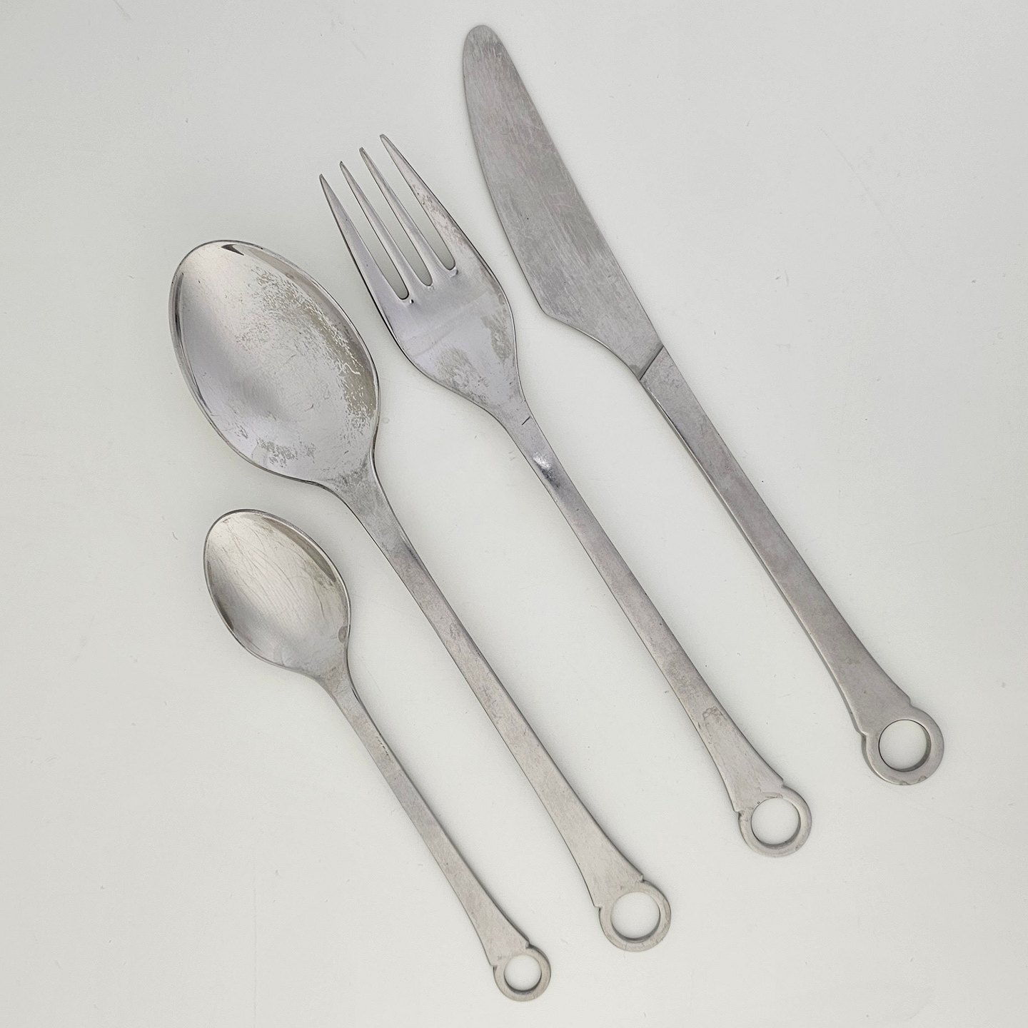 Bestik i rustfrit stål fra serien Pantry bestående af kniv, gaffel, spiseske og teskeFormgiver Henning Seidelin