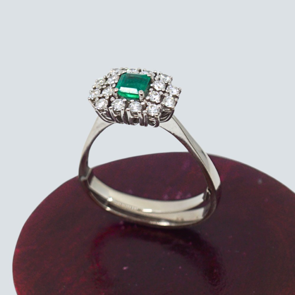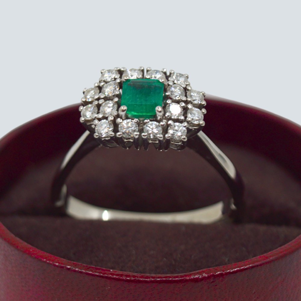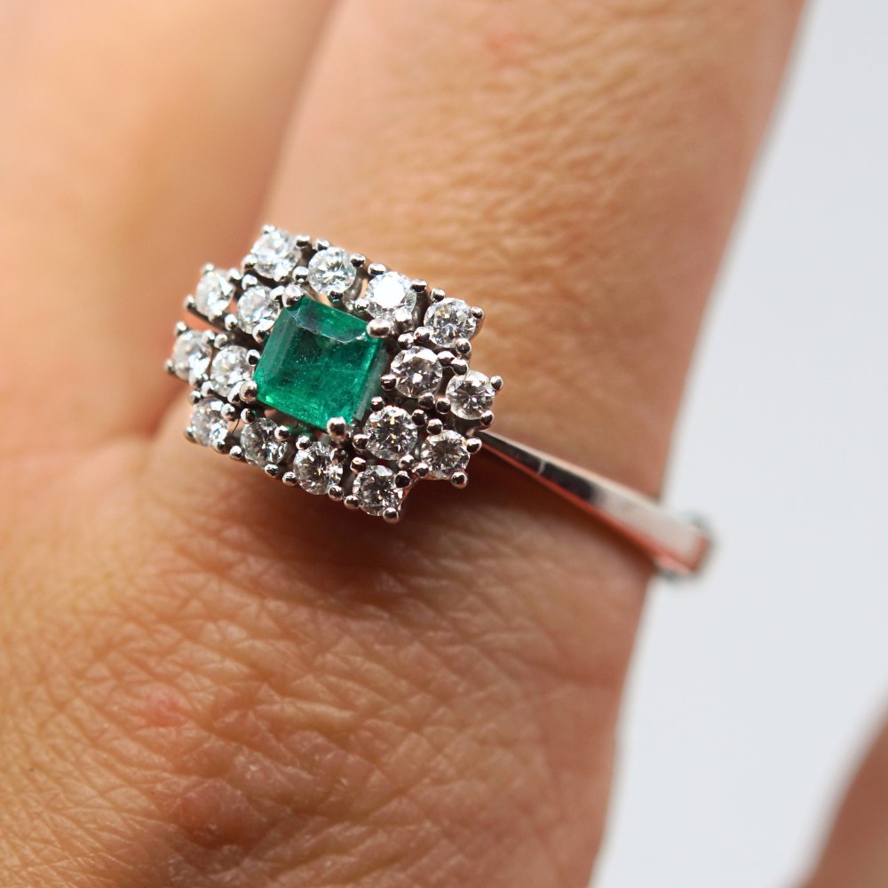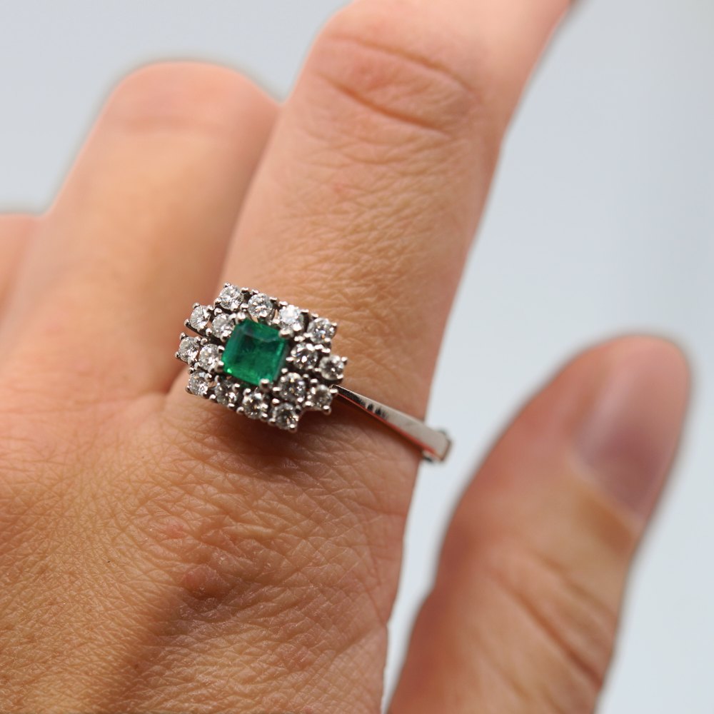 Carl Antonsen; Ring i 14 kt. hvidguld, prydet med diamanter og smaragd. Omkring ring str. 61. Med aftagelig skinne, som gør ringens størrelse mere fleksibel. Stemplet "CA 585".