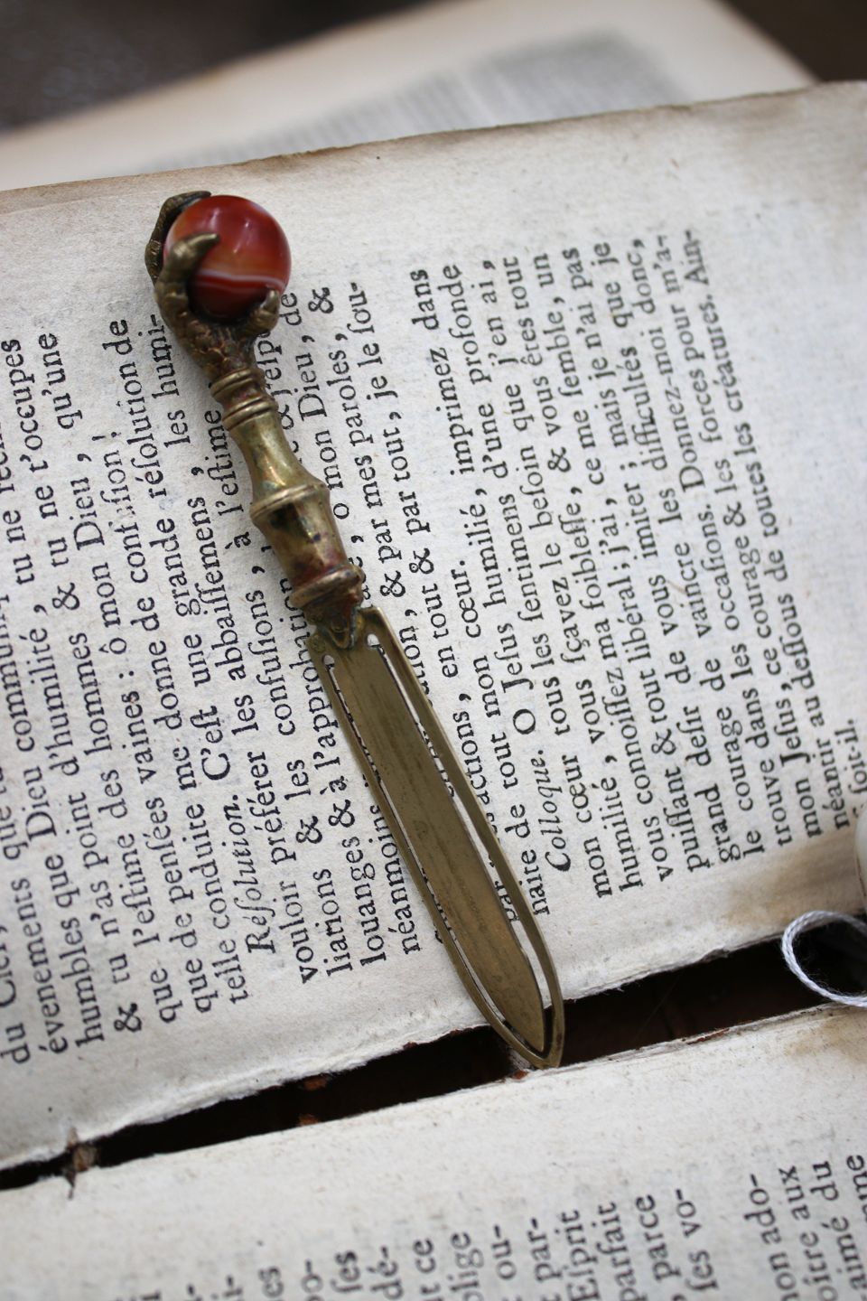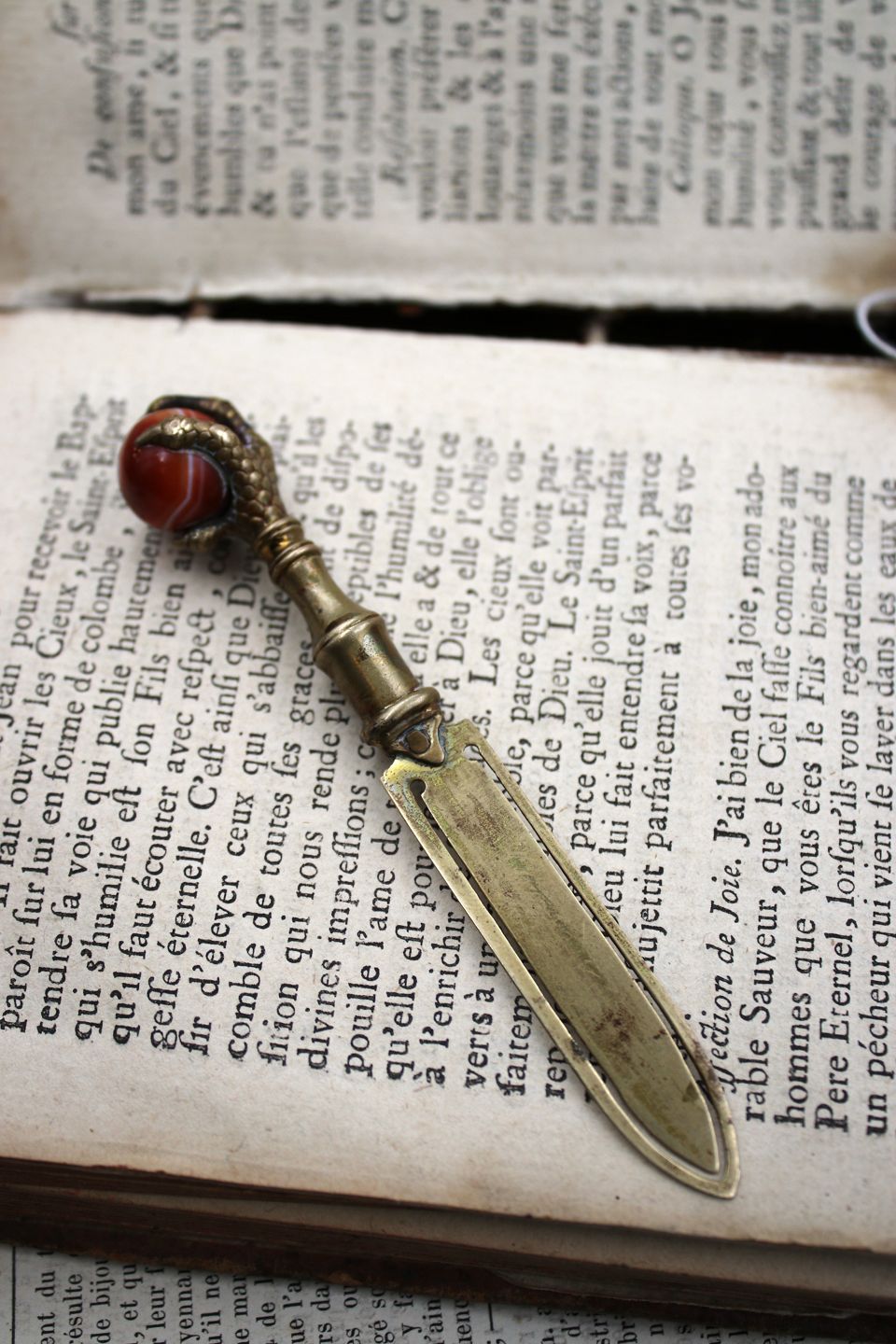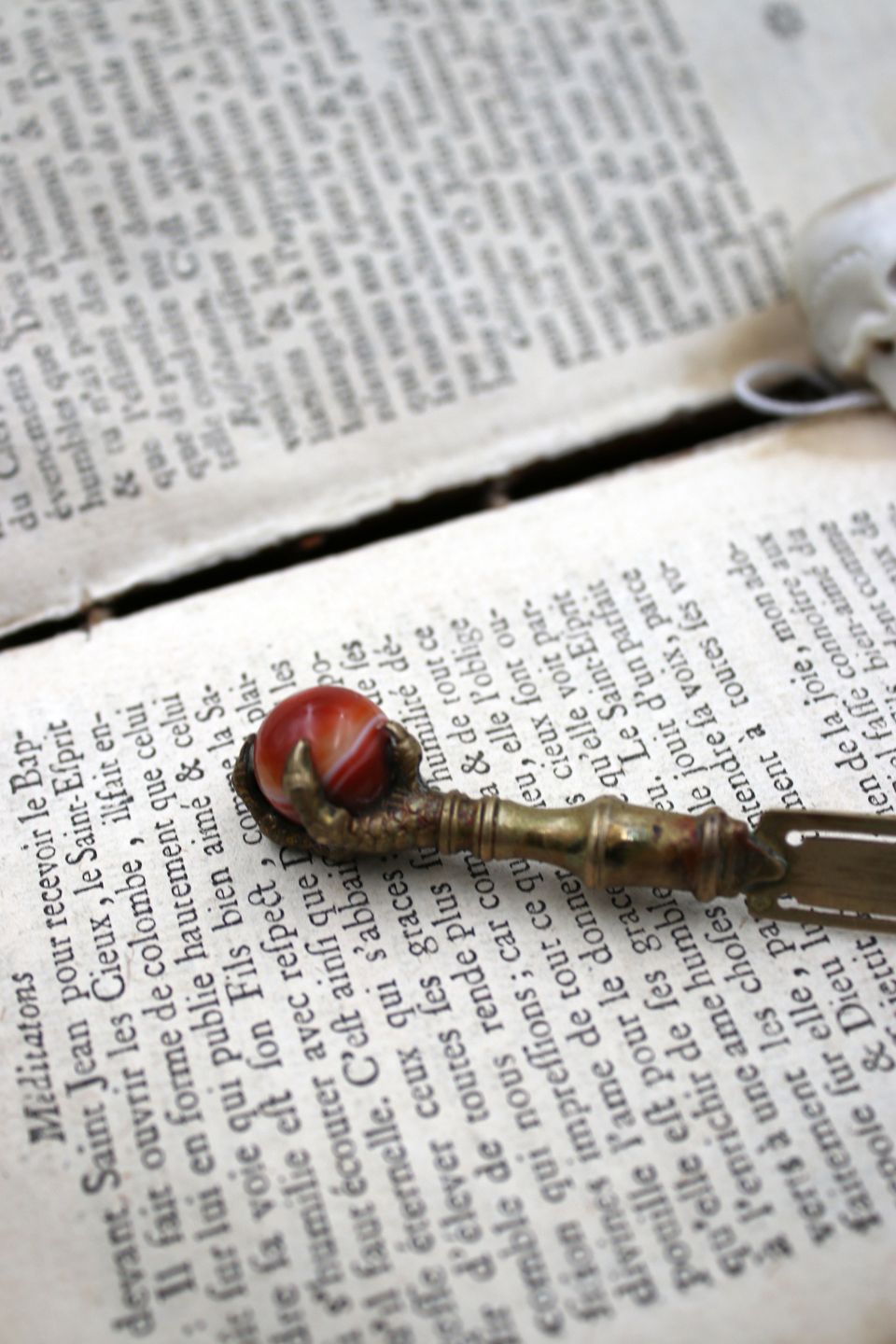 Antikt 1800 tals bogmærke i messing med ørneklo der griber om en marmor kugle...