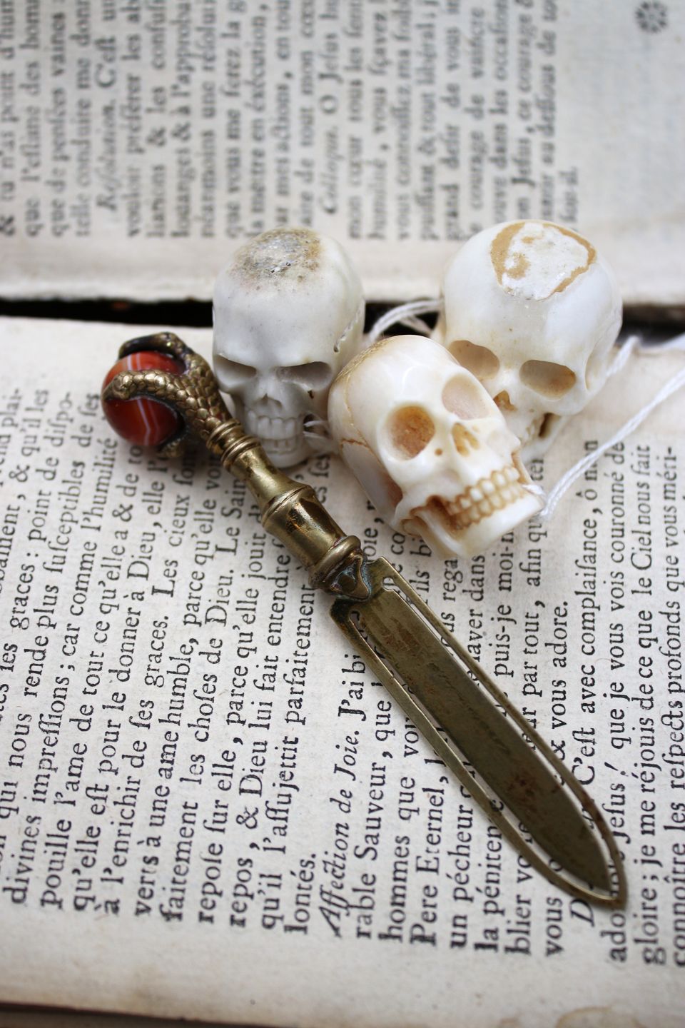 Antikt 1800 tals bogmærke i messing med ørneklo der griber om en marmor kugle. Længde: 10cm.Emne nummer: 1800 tals bogmærke
