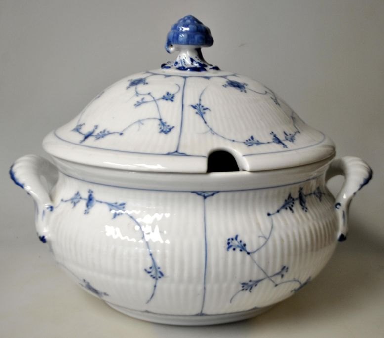 Royal Copenhagen Runde Terrine, Nr. 2, blaue geriffelt, 1850 - 1875, Kopenhagen, Dänemark. Mit Deckel. Gestempelt. H.: 24 cm. Durchmesser: 24 cm.