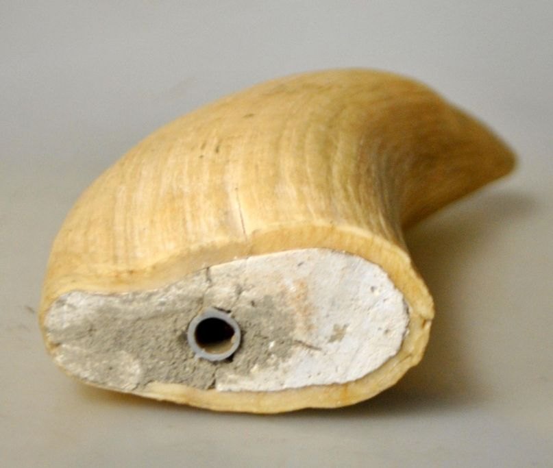 Grönländischer Narwalzahn, 19./20. Jahrhundert. Länge: 13 cm. Ausgefüllt, damit er auf einem Teller befestigt werden kann.Bestellnummer: 28619