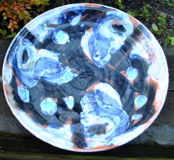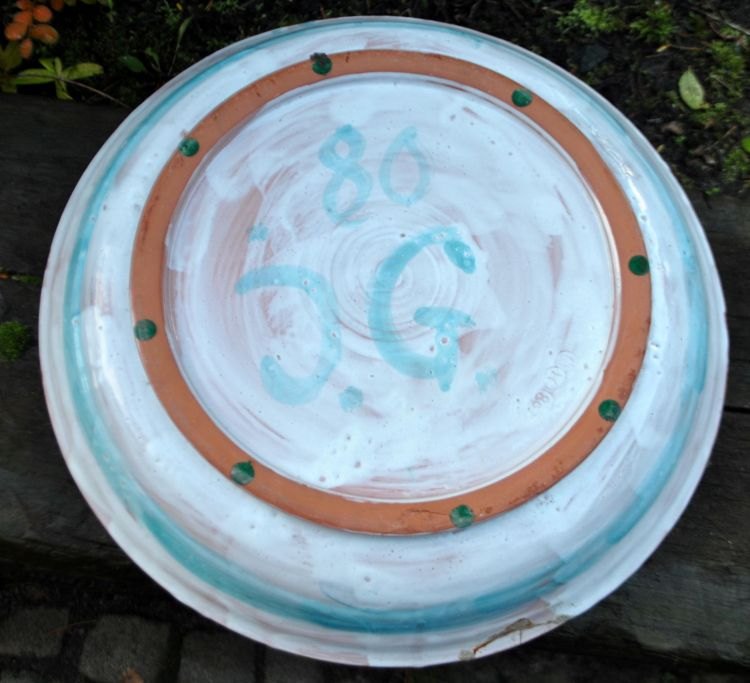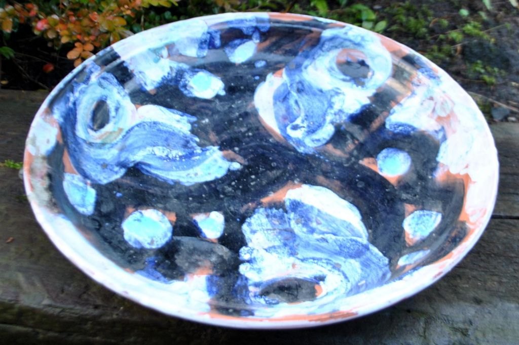 Glud, Jørgen (1913–2003), Dänemark: Keramikschale, 1980. Roter Ton. Glasur in Schwarz, Blau, Weiß und Grün. Signiert: JG 80. Durchmesser: 37 cm.Bestellnummer: 28648