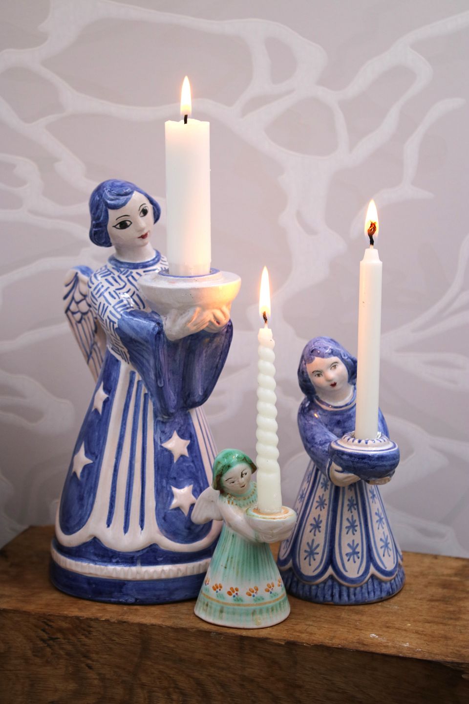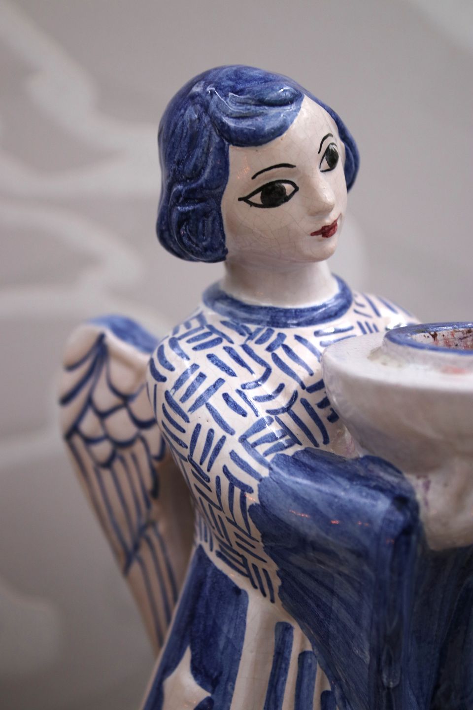 L. Hjorth keramik sjælden stor engel med blå / hvid glasurder holder et almindelig størrelse stearinlys. Højde: 22cm.