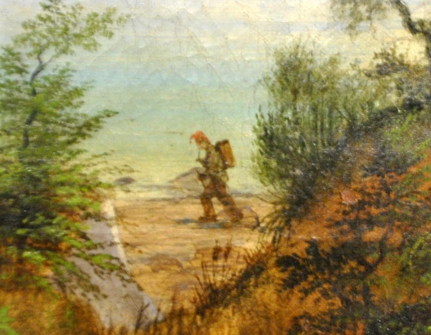 Holm, Peter (1798–1875) Dänemark: Blick über die Bucht von Aarhus auf Aarhus mit dem Dom. Ansicht von Risskov. Im Vordergrund ein Wanderer. Unsigniert. 40 × 55 cm.