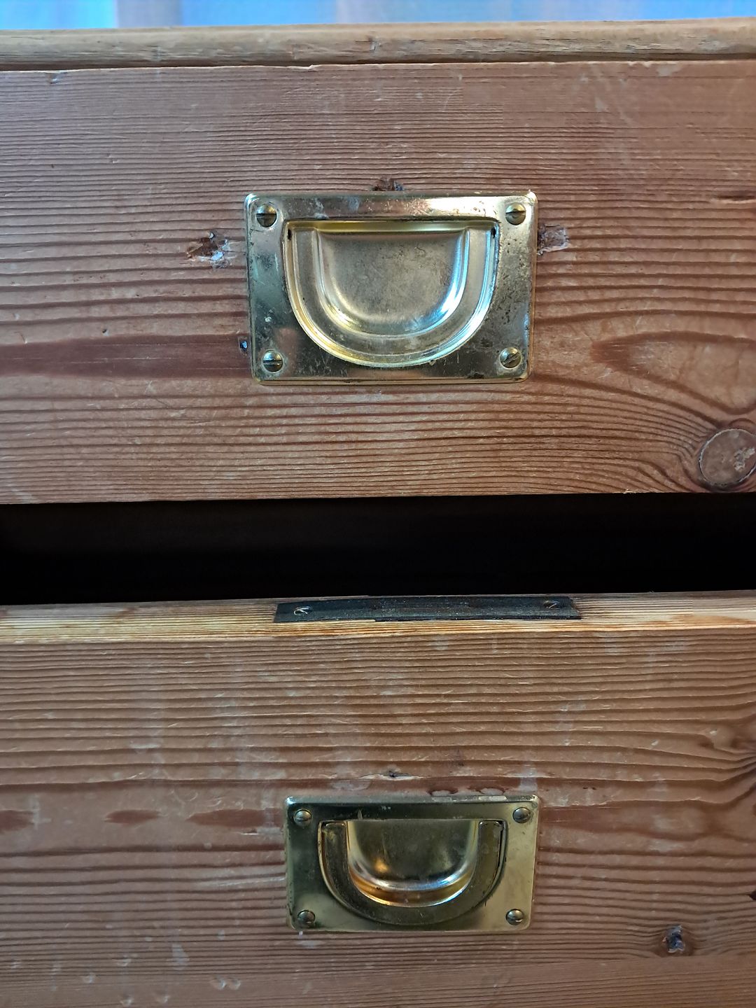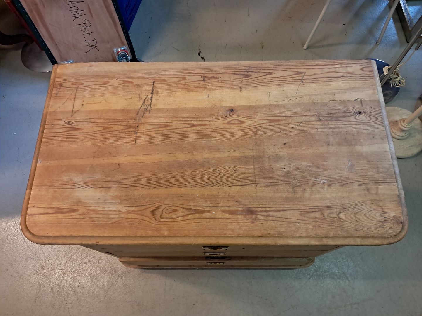 Kommode i massivt fyrretræ, fra 1910erne.Den har brugsspor og mangler det øverste håndtag.