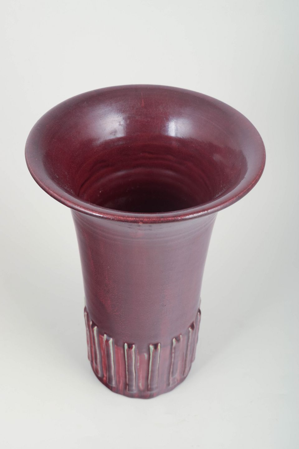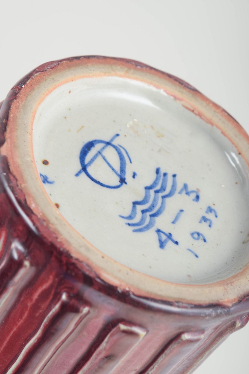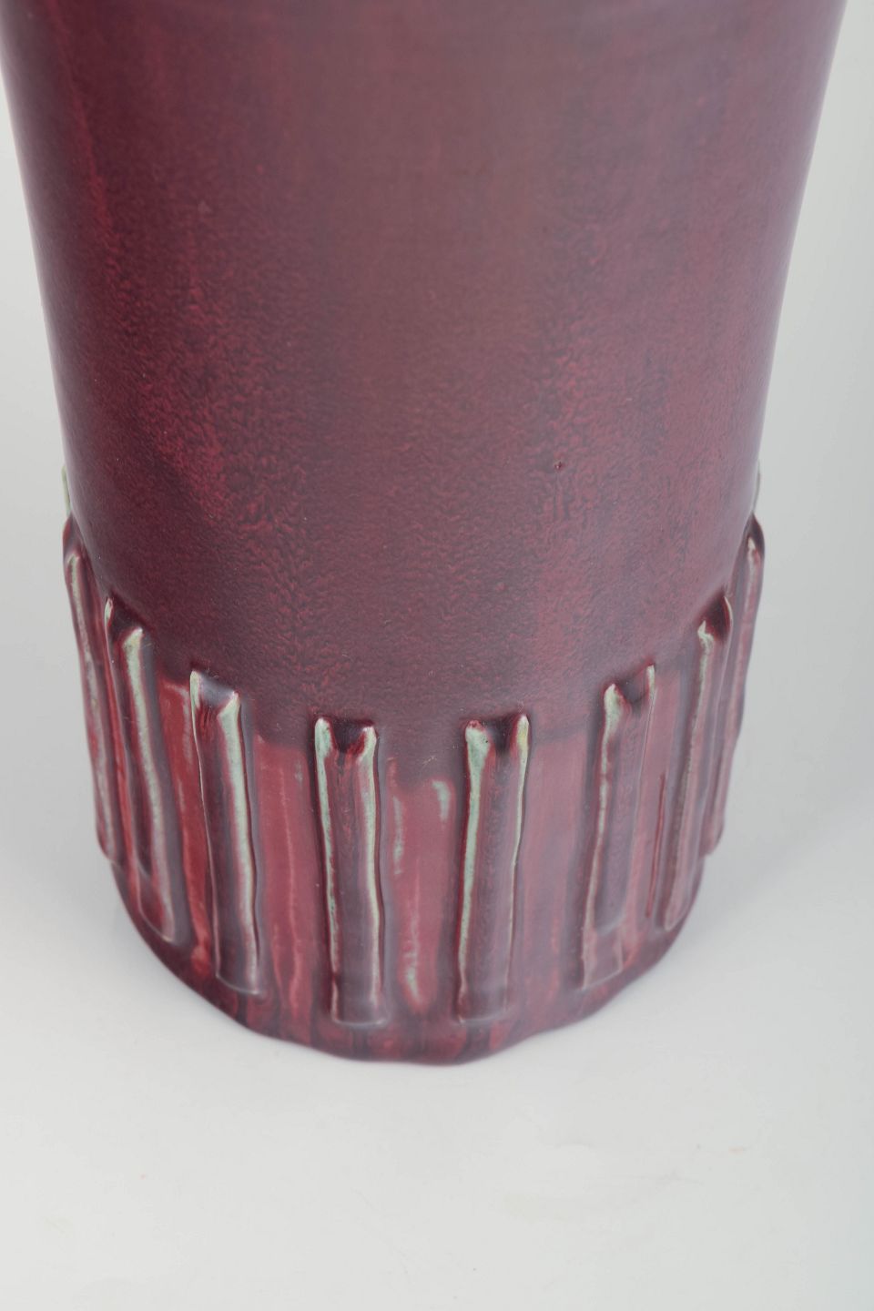 Imposant kegleformet vase i stentøj med dyb, mættet okseblodsglasur og vertikale reliefribber langs den nedre del. En markant og tidlig signaturform fra Olsen, udført i Royal Copenhagens kunststentøj.