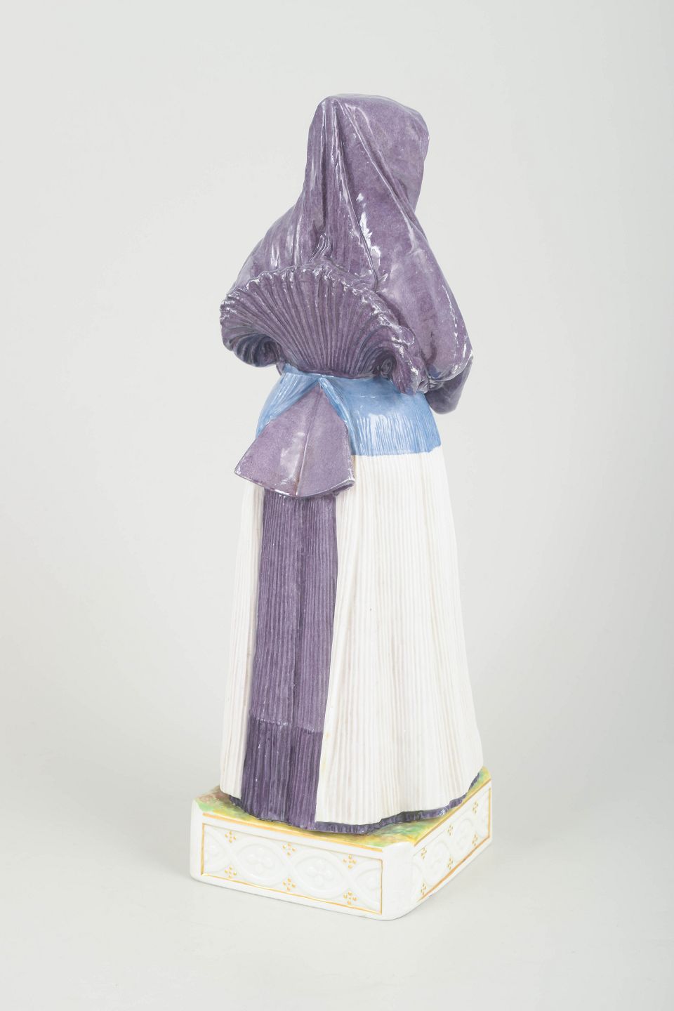 Håndmalet figur forestillende en kvinde i traditionel folkedragt, stående på rektangulær sokkel dekoreret i overglasur. Undersiden med indskriften “MARCHEN CHRILLES BACHERS” samt Juliane Marie-mærke.