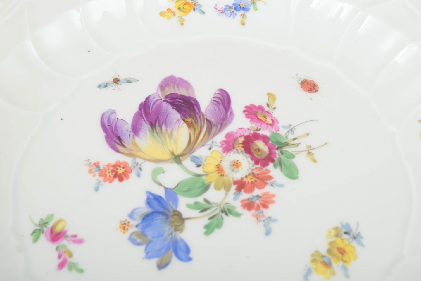 Elegant sæt håndmalede tallerkener i hvidt porcelæn med farverige blomsterbuketter, små spredte blomster og profil­eret reliefkant med guldbort. Klassisk Meissen-arbejde af høj kvalitet.