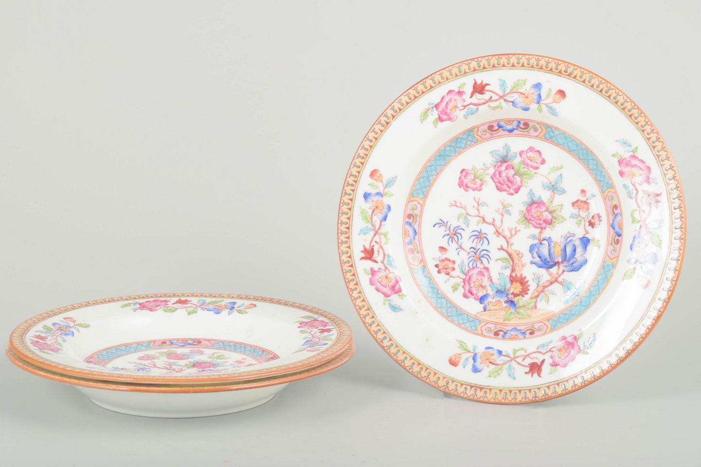 Cauldon China, EnglandTre dybe tallerkener i fajance med farverig, orientalistisk inspireret blomsterdekoration i rosa, blå og turkis nuancer. Klassisk Cauldon-dekor med dekorativ kant i varme toner.