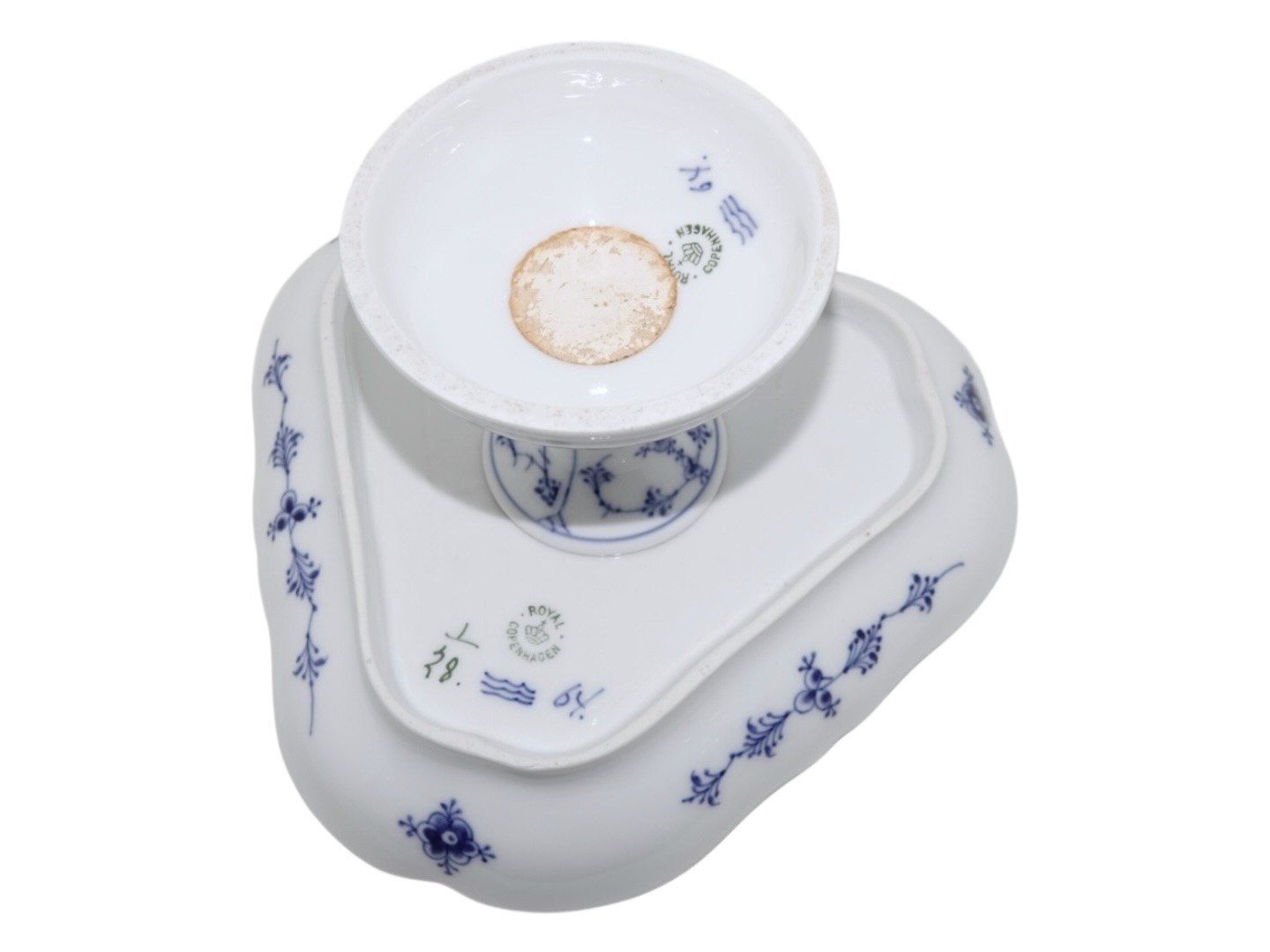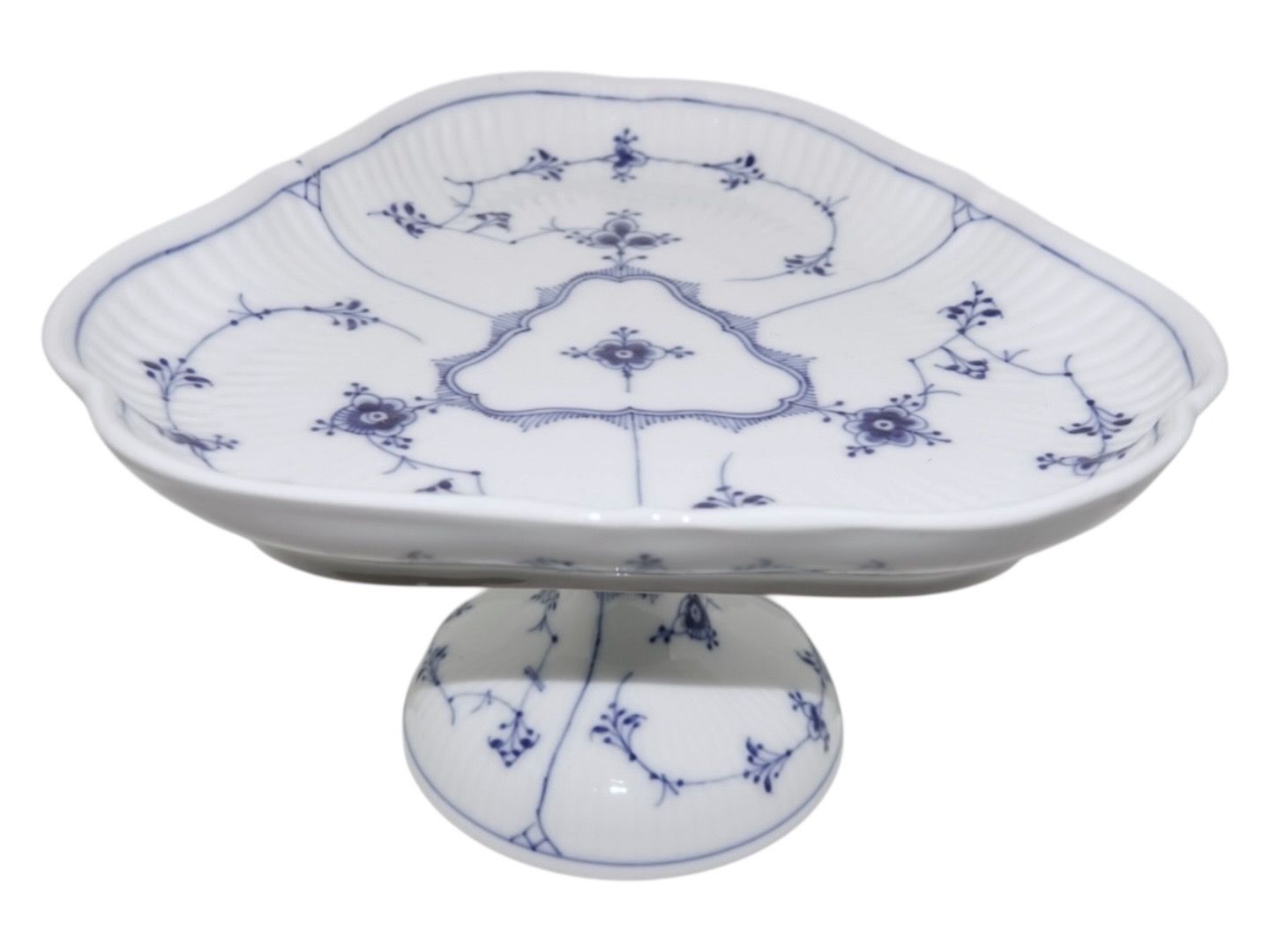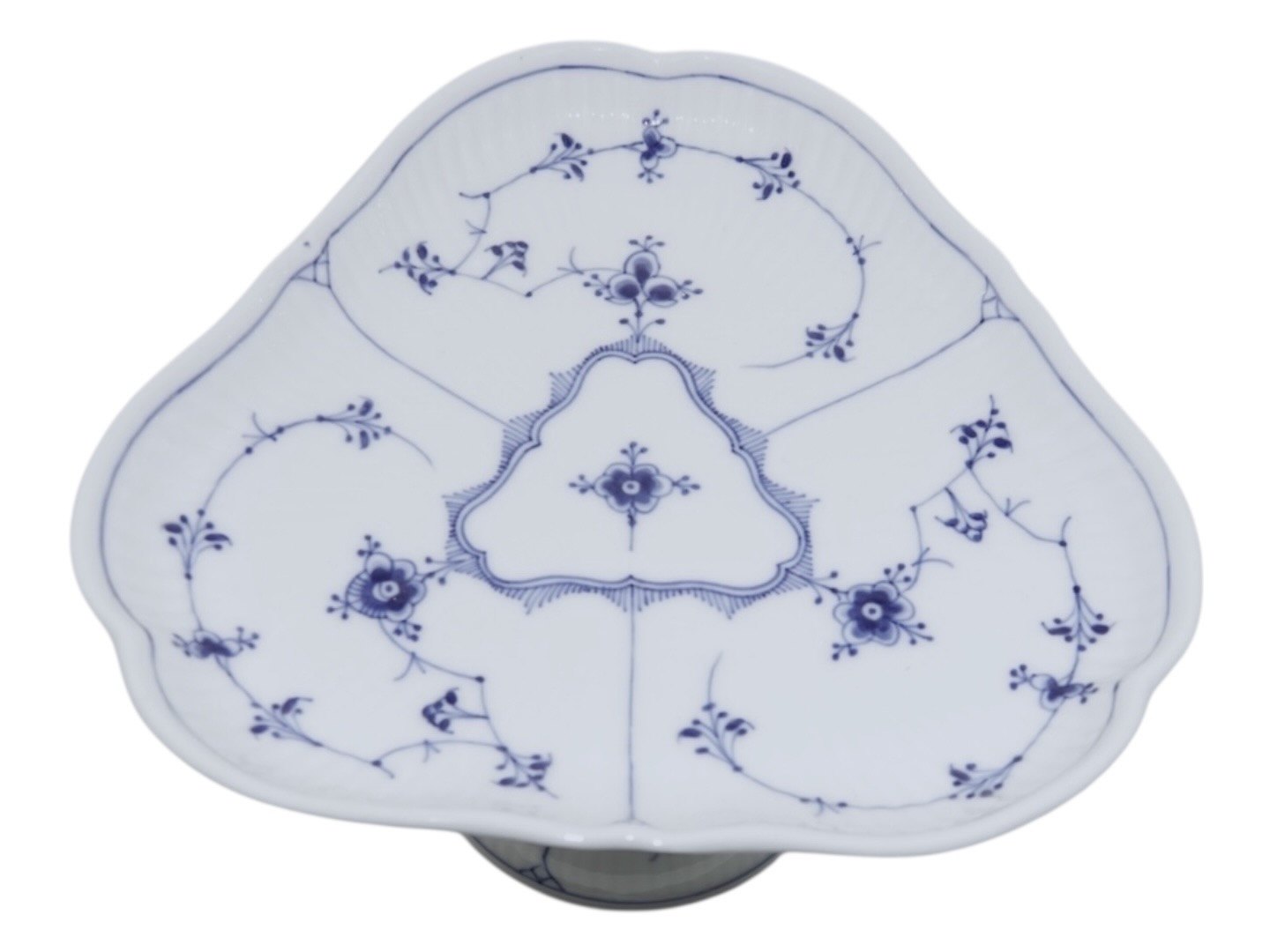 Royal Copenhagen Musselmalet Riflet, sjælden set trekantet kageopsats på fod.Dekorationsnummer 1/28.