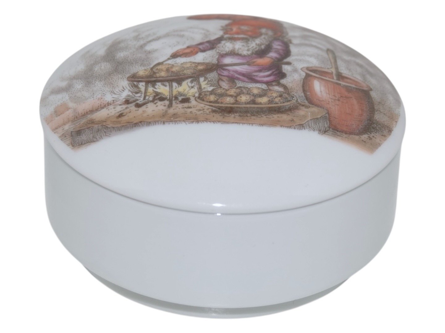 Bing & Grøndahl JulestelRund bonbonniere med julenisse der bager æbleskiver