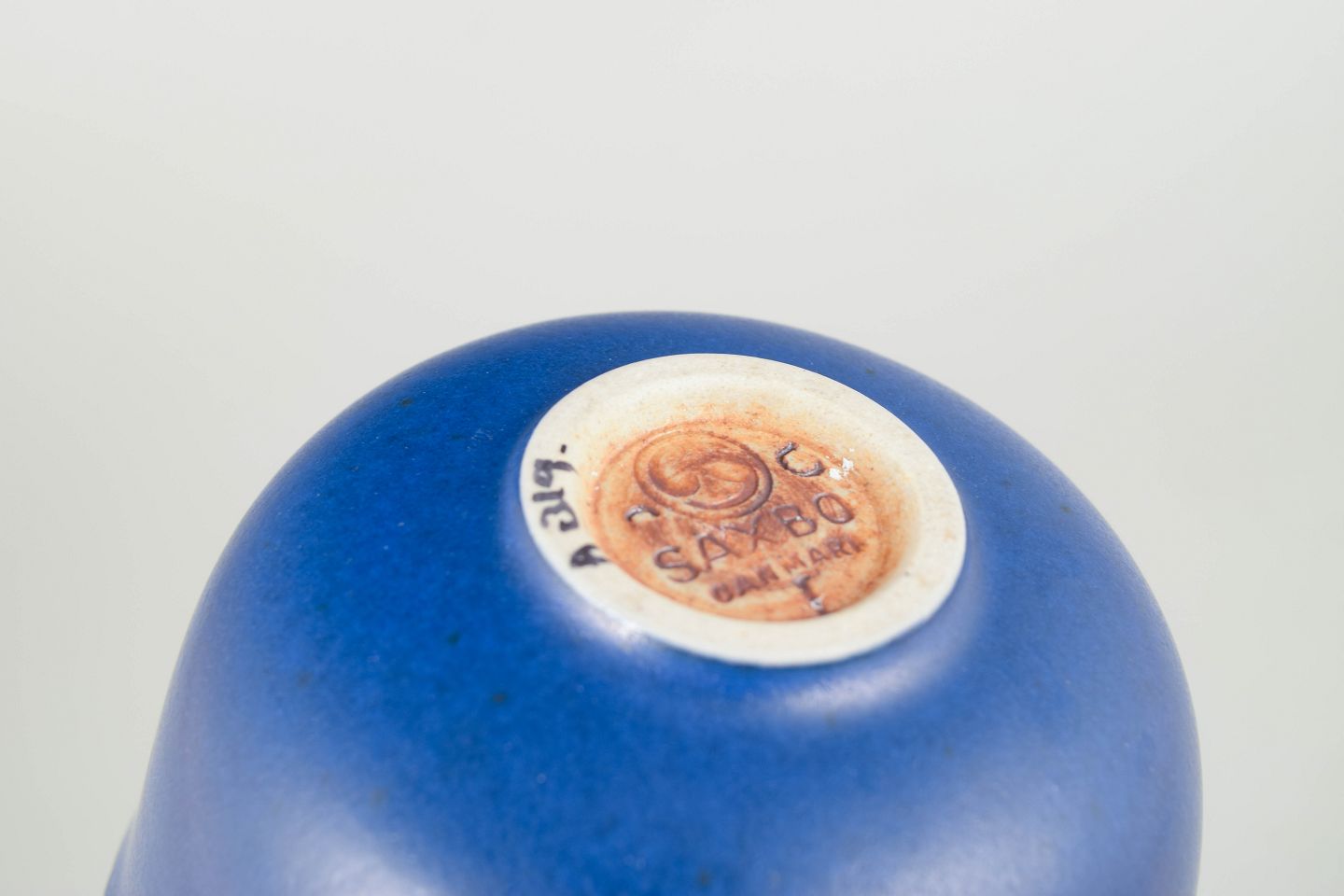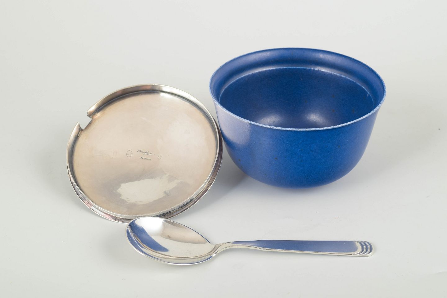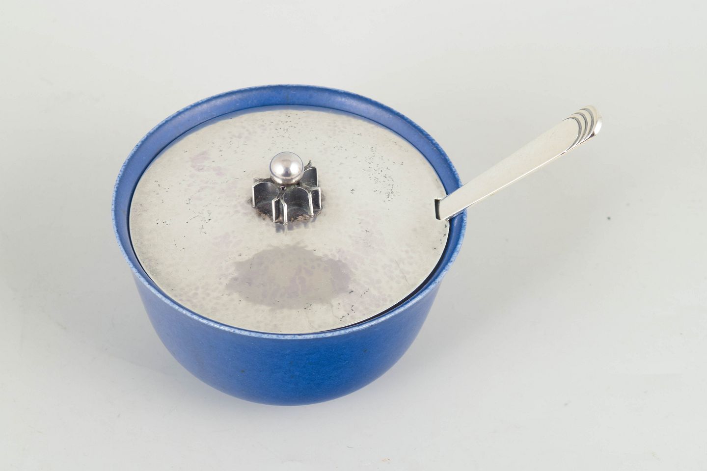 Saxbo Art Deco marmeladekrukke Hans Hansen sterlingsølvlåg, 1934.Elegant marmeladekrukke i klassisk Saxbo-stentøj med dyb blå glasur, Hans Hansen sterlingsølvlåg (1934) og Hans Hansen 830 sølvske.