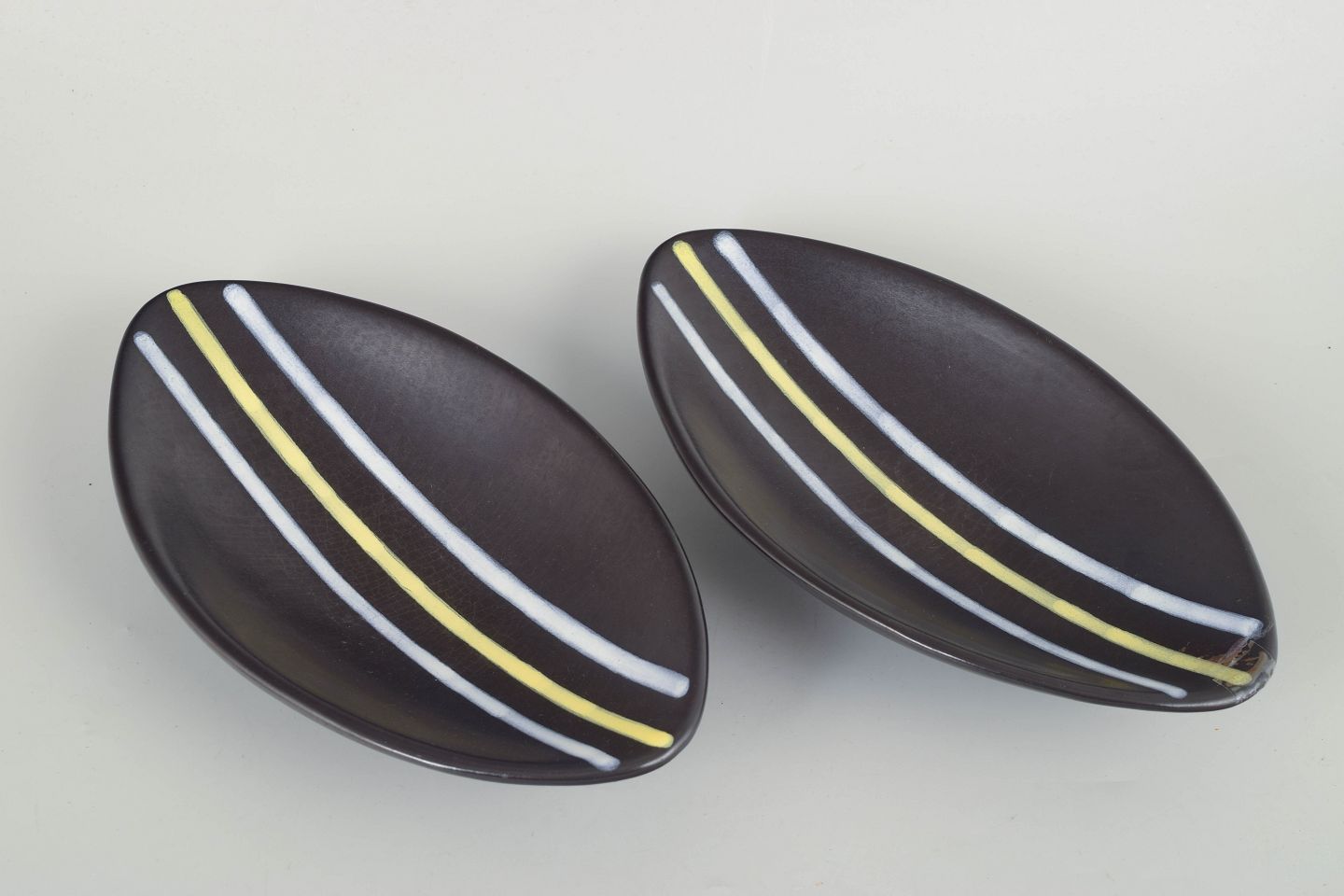 To keramiske skåle fra den ikoniske “Trio”-serie, dekoreret med karakteristiske hvide og gule linjer på mørk baggrund. Aflang, elegant form, typisk for Oldfors’ modernistiske designs.