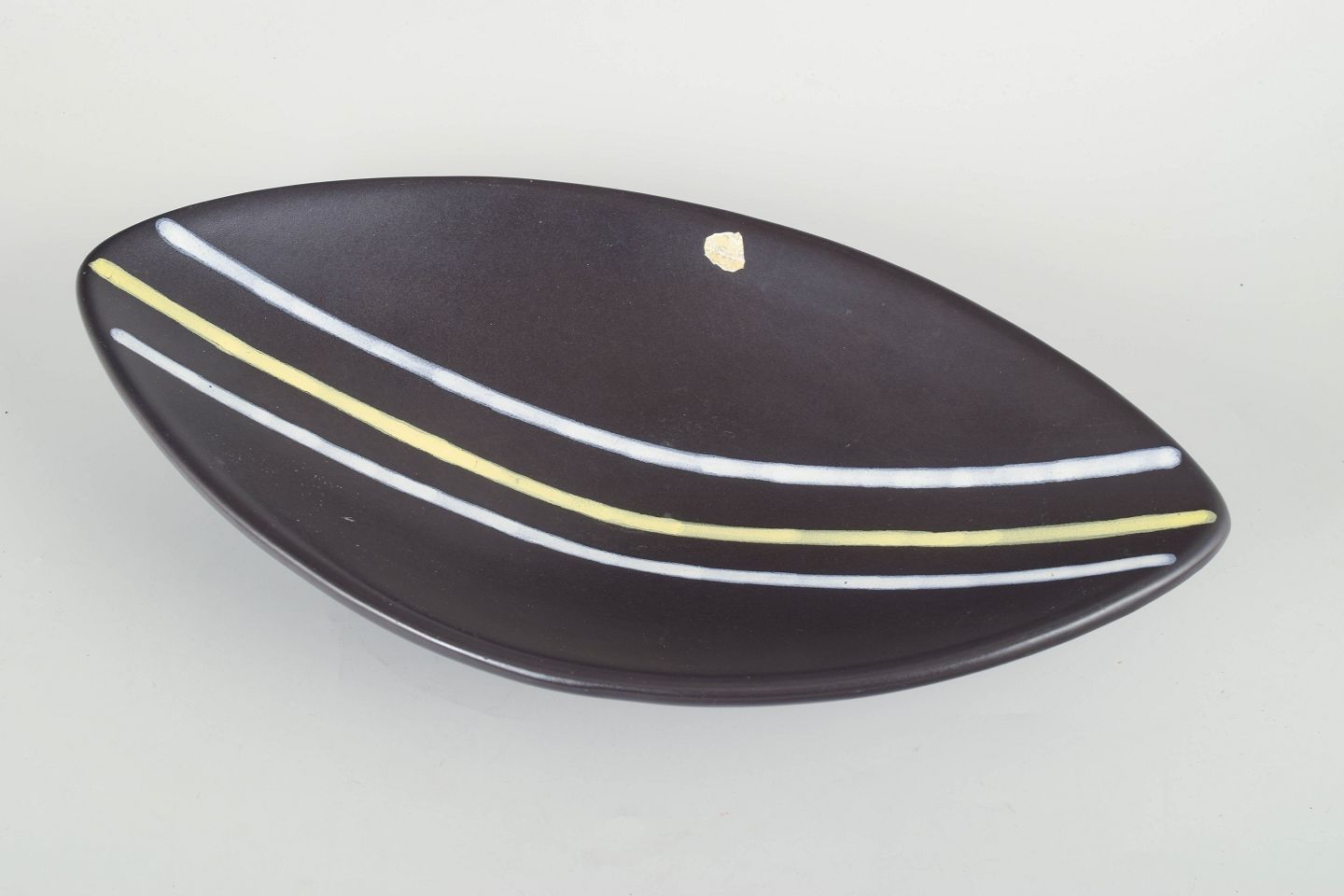 Keramisk skål i den ikoniske “Trio”-serie, dekoreret med grafiske linjer i hvid og gul på mørk baggrund. Elegant, aflang form, typisk for Oldfors’ modernistiske formsprog.