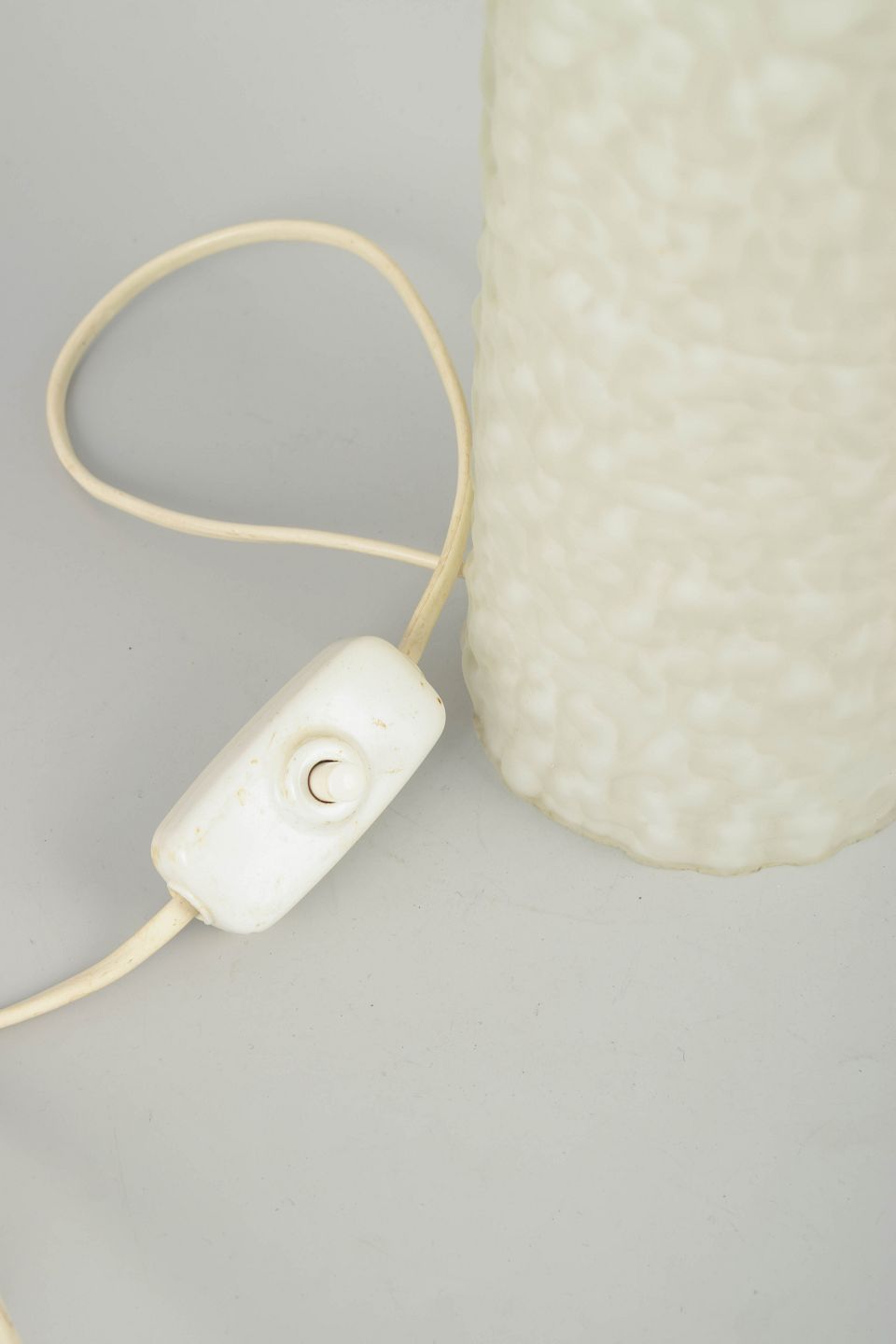 Svensk design – bordlampe i glas og messing, 1970’erne.Elegant bordlampe i presset hvidt glas med struktureret overflade og cylinderformet messingtop. Original ledning ca. 2 meter. Et karakteristisk stykke skandinavisk 70’er-belysningsdesign med enkel, men markant materialekontrast.
