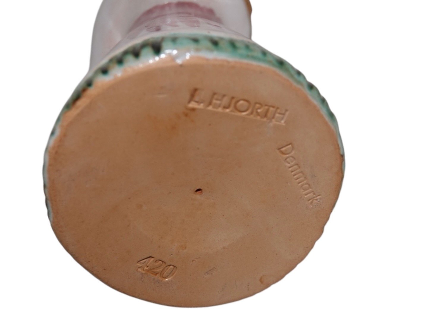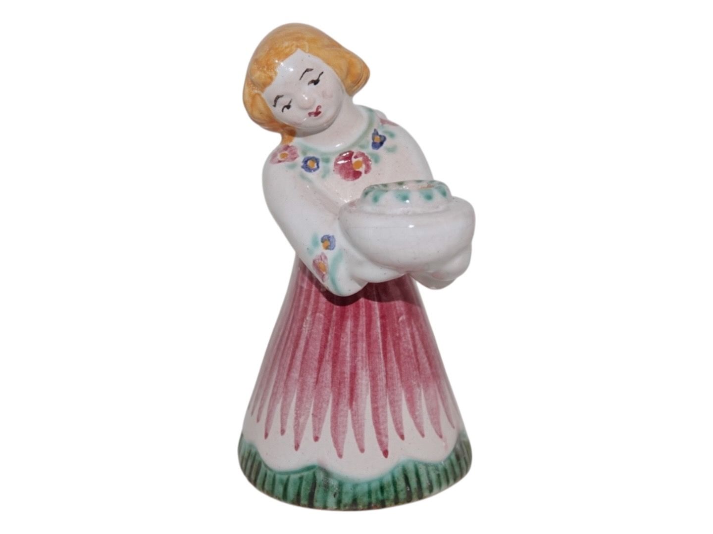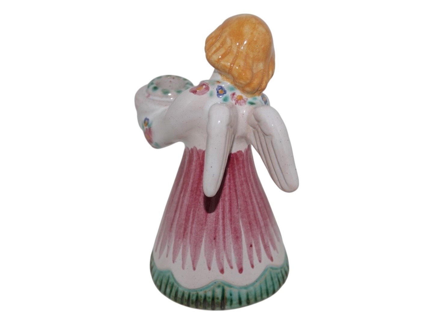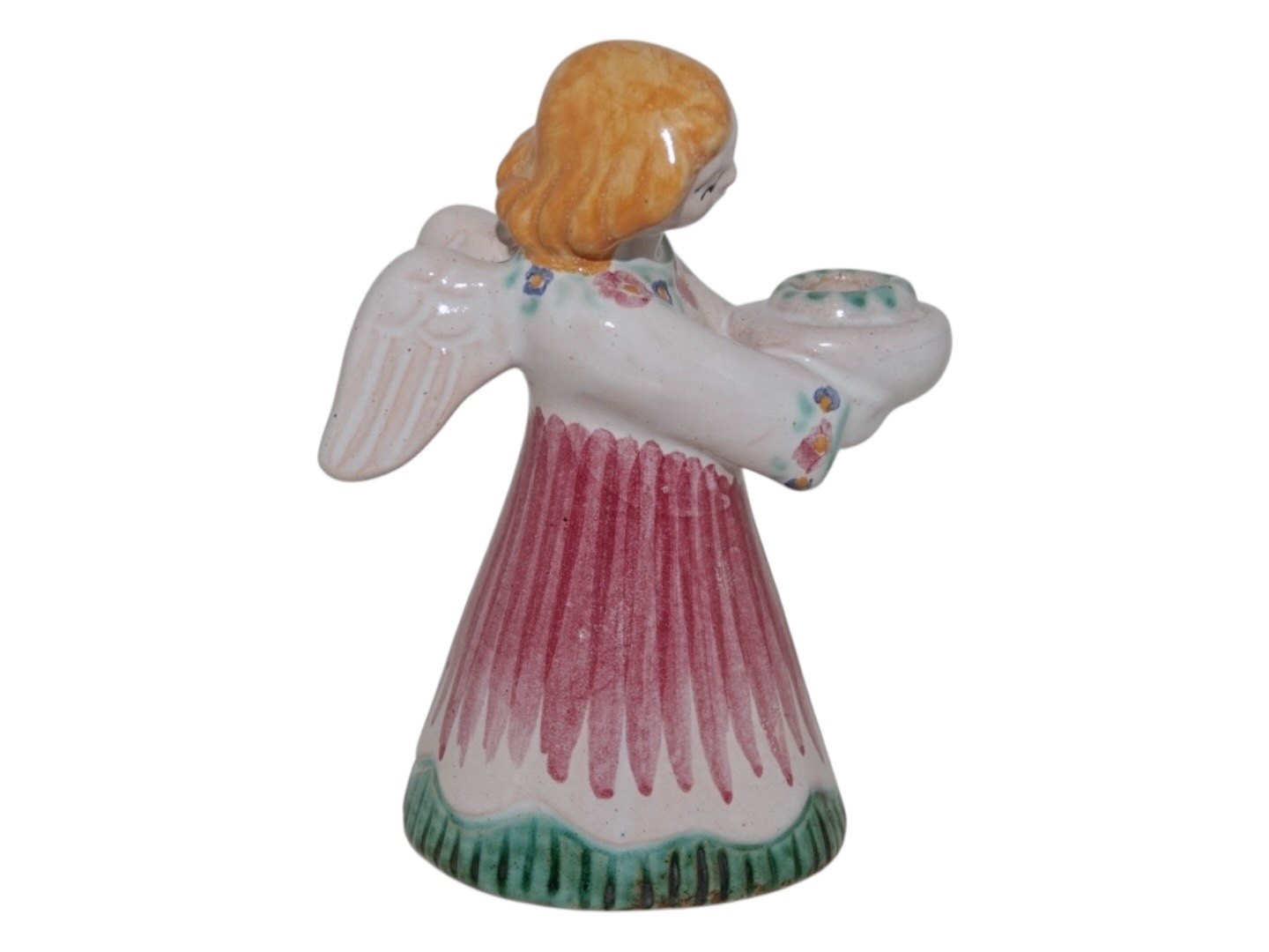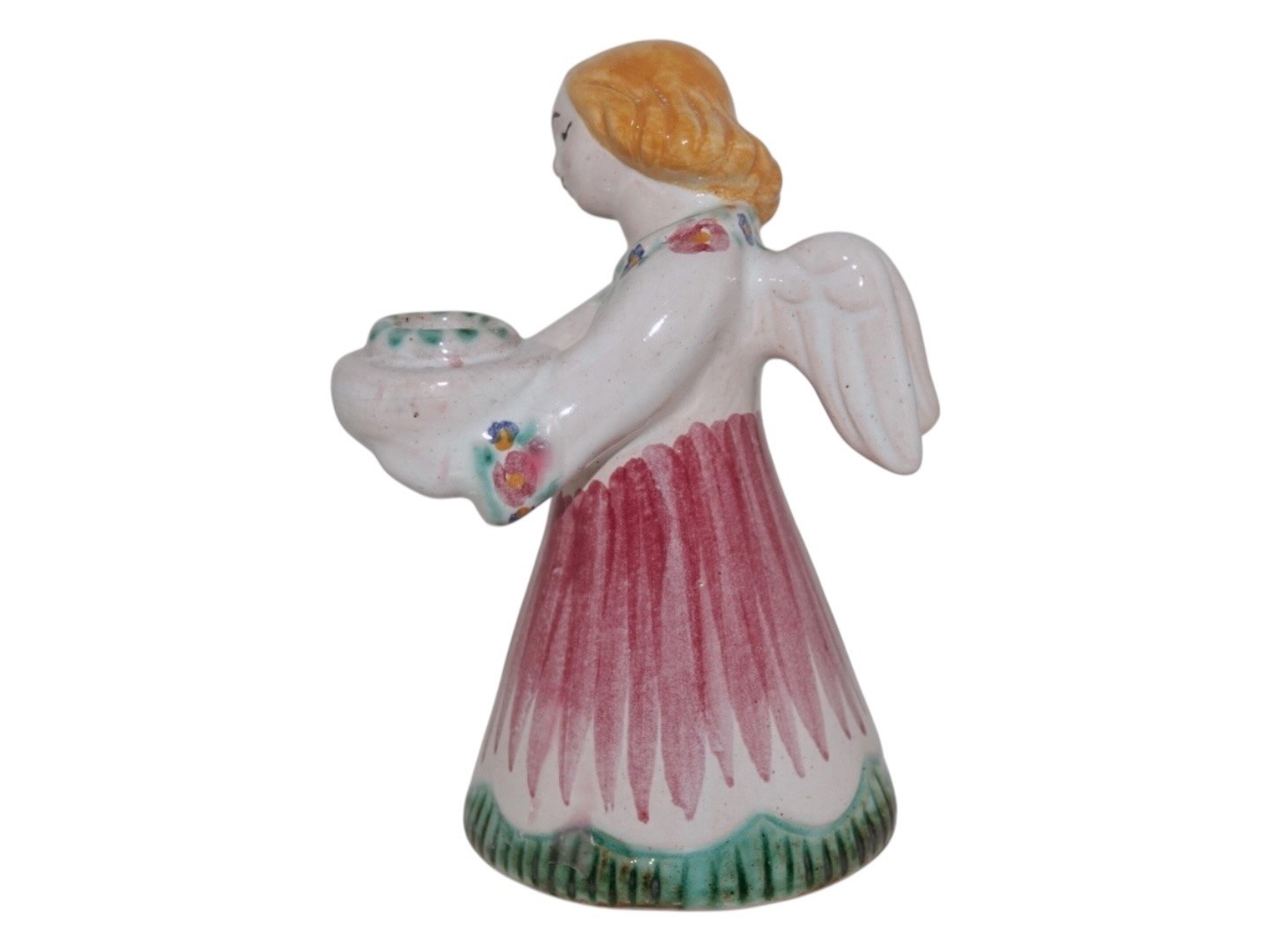 Hjorth Keramik, engel figur / lysestage med rød, grøn og gul dekoration.Dekorationsnummer 420.