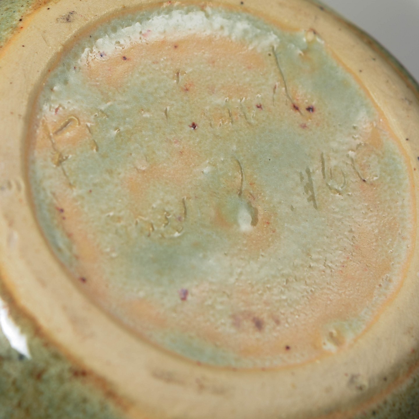 Lille, hånddrejet vase i stentøj med afrundet cylindrisk form og lille, koncentrisk markeret hals. Glasuren er i varme grøn-gulnede nuancer med fint meleret spil, typisk for skandinavisk studiokeramik fra perioden. Signeret.
