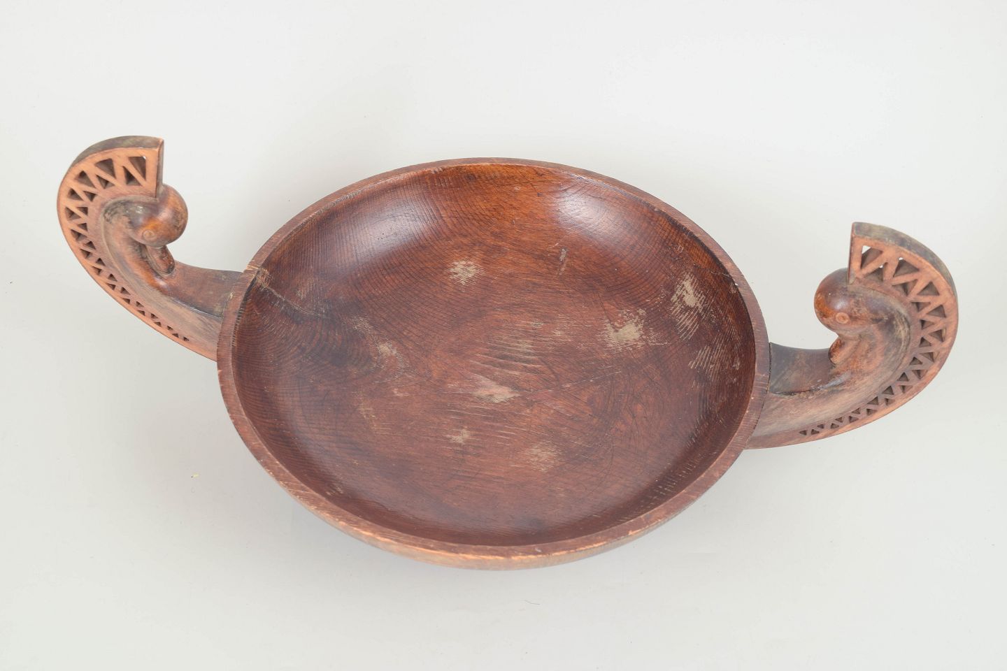 Dekorativ, håndudskåret træskål med karakteristiske dobbeltstående fuglehoveder i hver side – et motiv stærkt forbundet med Kalevala Korus tidlige formsprog. Den varme patina og de fint gennembrudte detaljer understreger Paaers særlige evne til at forene nordisk ornamentik med funktionelt kunsthåndværk. Signeret.