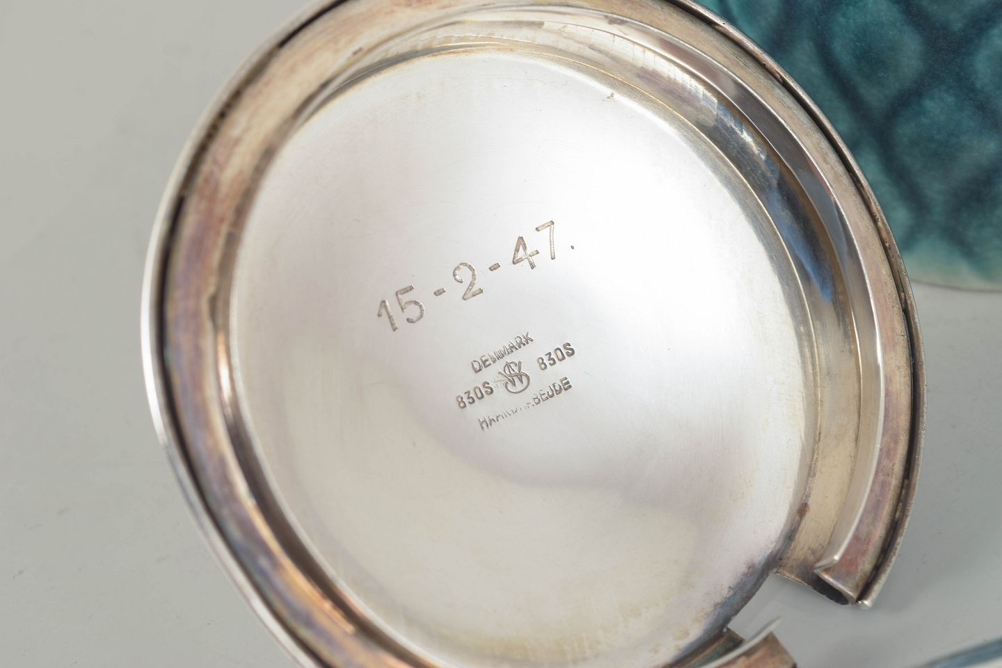 Erik Rahr for SaxboMarmeladekrukke med tretårnet låg og tretårnet sølvske, midt 1900-tallet.
