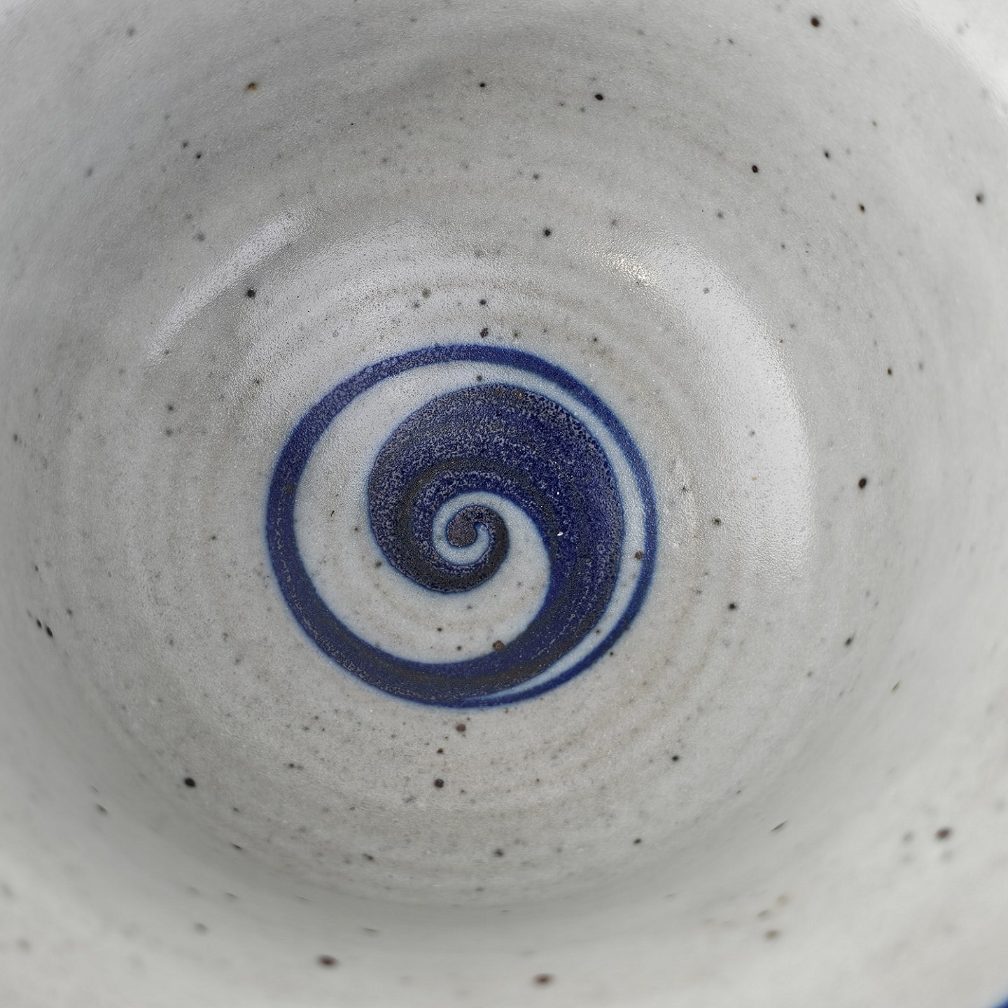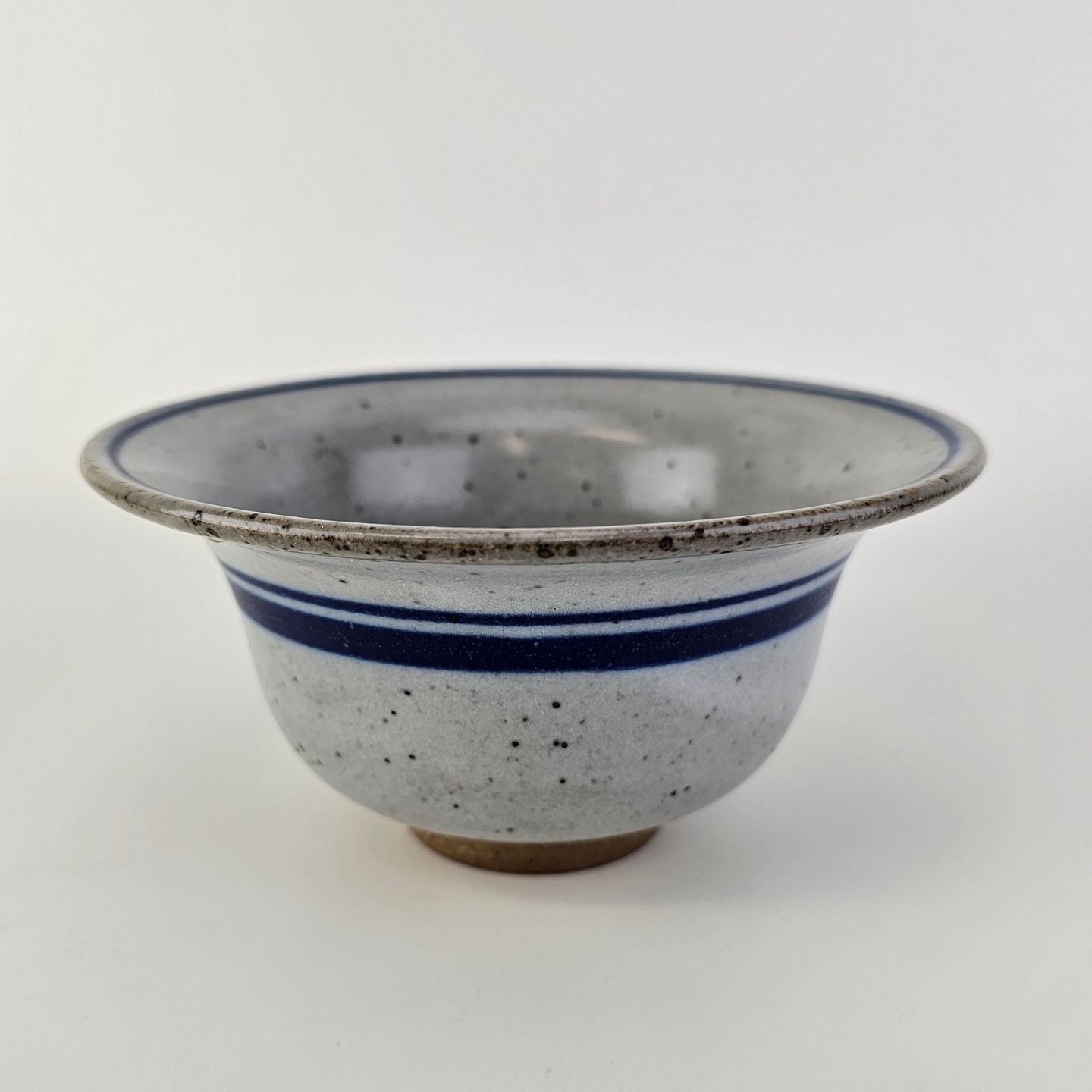 Skål i glaseret stentøj i hvide nuancer med dekoration af blå striber og en blå hvirvel i bunden54