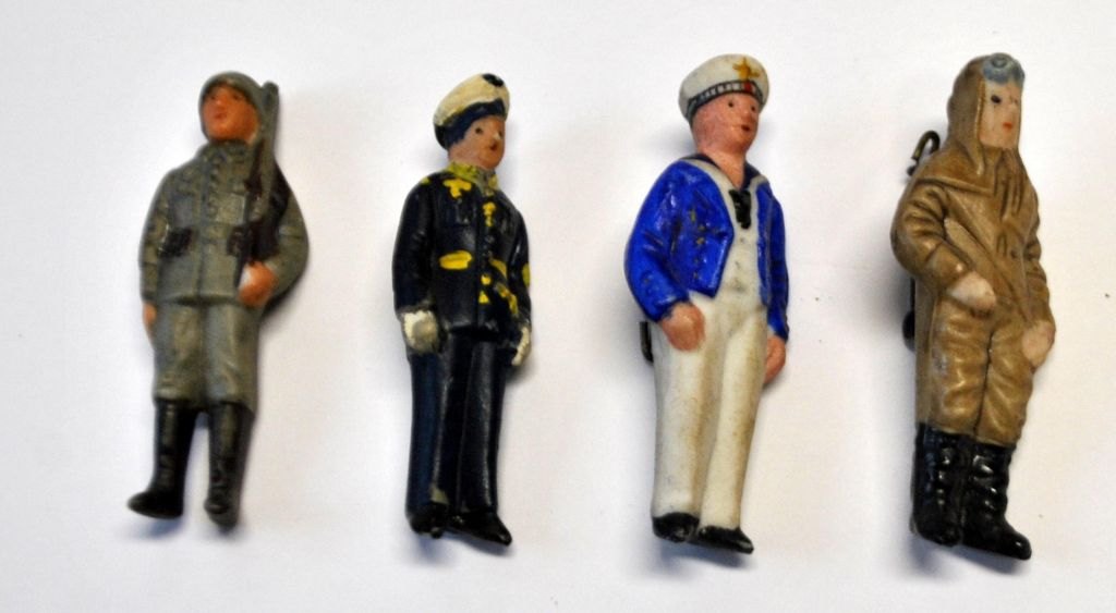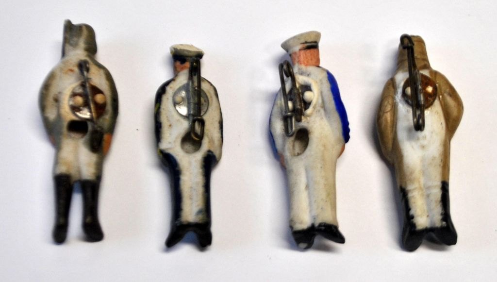 Sammlung deutscher, handbemalter Biskuitporzellan-Militärbroschenfiguren, um 1933. Dargestellte Figuren: Ein Soldat, ein Flieger, ein Matrose und ein Marinekapitän. Höhe: 4,5 cm.Nur zusammen erhältlich!