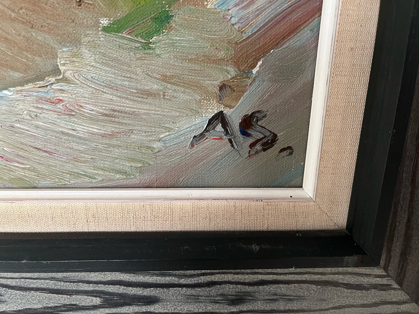 Maleriet er et landskabsmaleri udf�rt af den danske kunstner Aage Strand (1910�1975). V�rket er skabt i en modernistisk/impressionistisk stil og kendetegnes ved en markant anvendelse af impasto-teknik, hvor oliefarven er p�f�rt i tykke lag for at skabe tydelig tekstur og dybde.Oplysninger om v�rket:� Kunstner: Aage Strand (1910�1975), dansk maler.� Stilart: Modernisme/Impressionisme, karakteriseret ved synlige penselstr�g samt fokus p� lys- og farvespil.� Teknik: Oliemaleri p� l�rred udf�rt med impasto.� Motiv: Kyst- eller klitlandskab med graner og vand i baggrunden � et typisk motiv i Strands oeuvre, ofte inspireret af hans hjemegn i Nordjylland.� Signatur: V�rket er signeret, formentlig med kunstnerens initialer �AS�, nederst til h�jre.M�l.89�79Maleriet fremst�r i fremragende stand uden synlige fejl eller skader.Levering kan arrangeres850 / 5.000