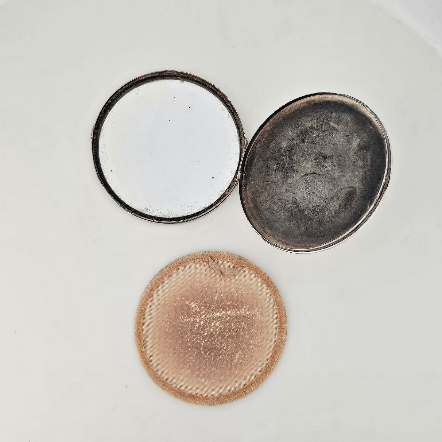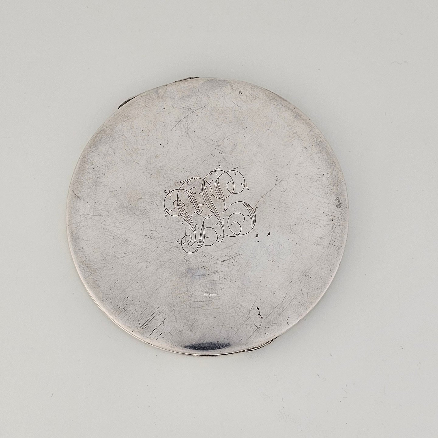 Rund pudderdåse med spejl i sterling sølv med monogram på bundenProducent Hans Jensen & Co.