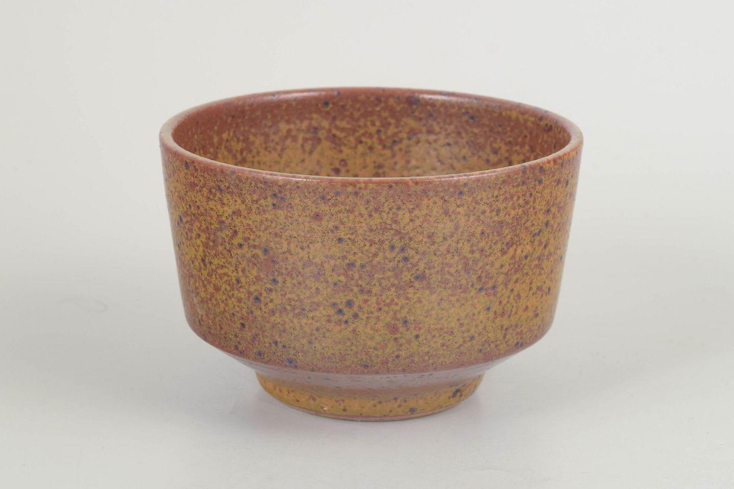 Håndglaseret stentøjsskål i varme brun-gule nuancer med tæt spættet overflade, karakteristisk for Starcks eksperimenterende farve- og teksturunivers i perioden.